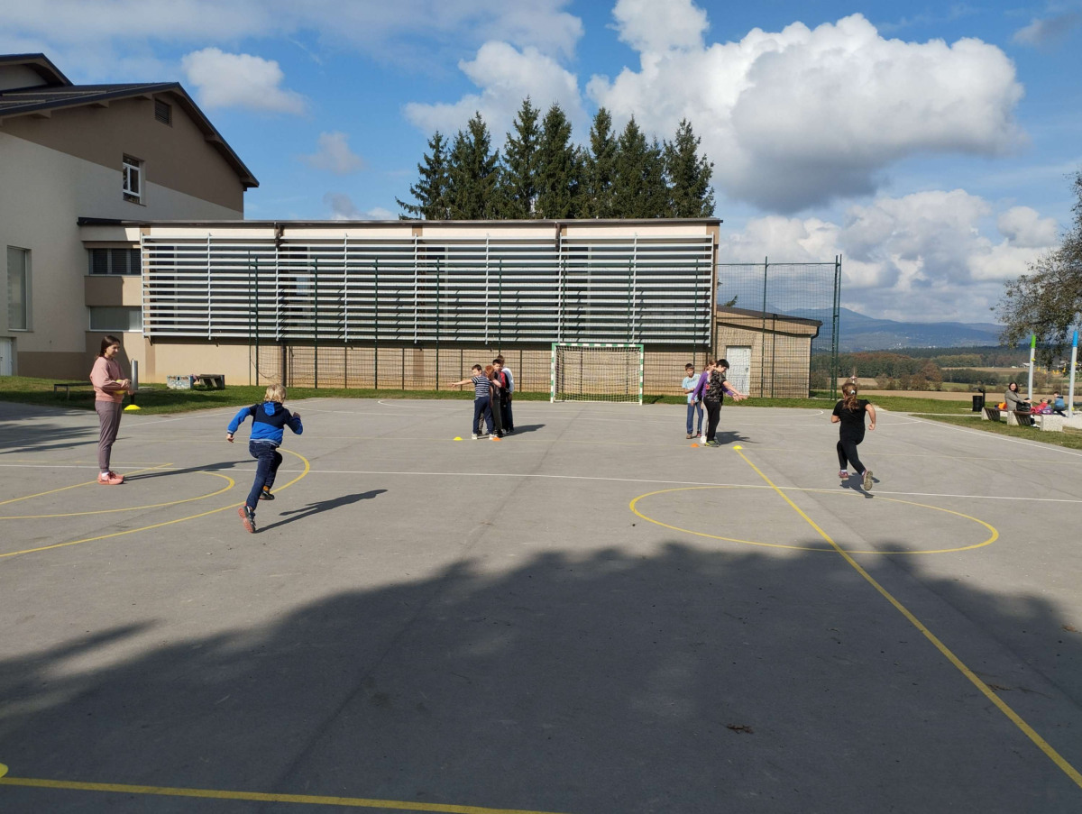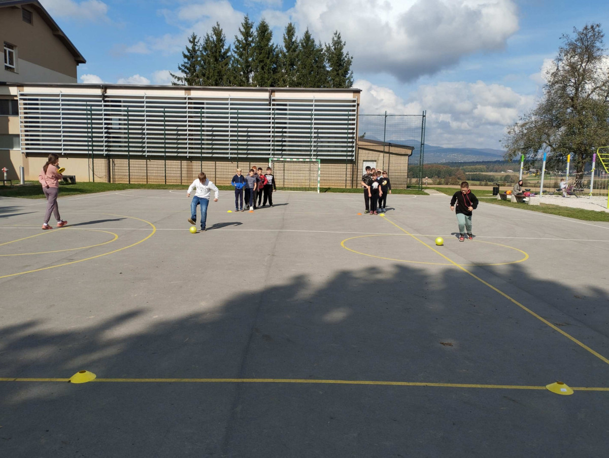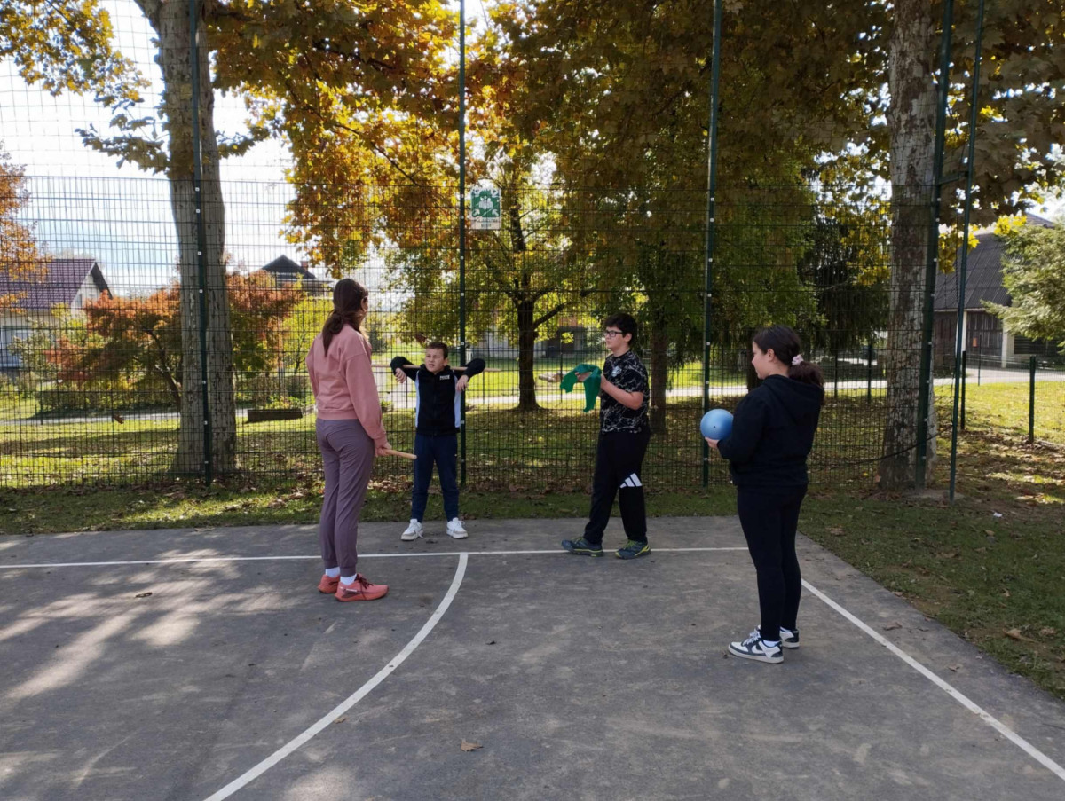 Po predavanju smo šli ven. Najprej smo se ogreli. Nato smo izvajali različne vaje za krepitev mišic z žogo, elastiko in palico. Nato smo imeli štafetno tekmovanje. Ob koncu dneva smo se igrali med dvema ognjema.