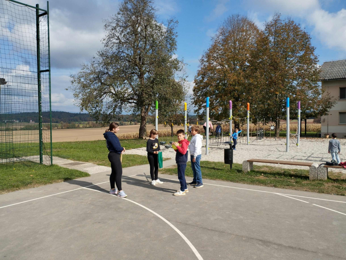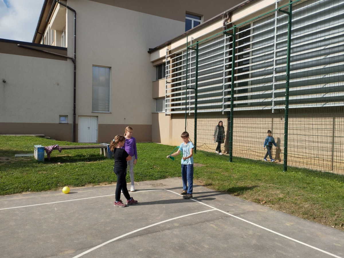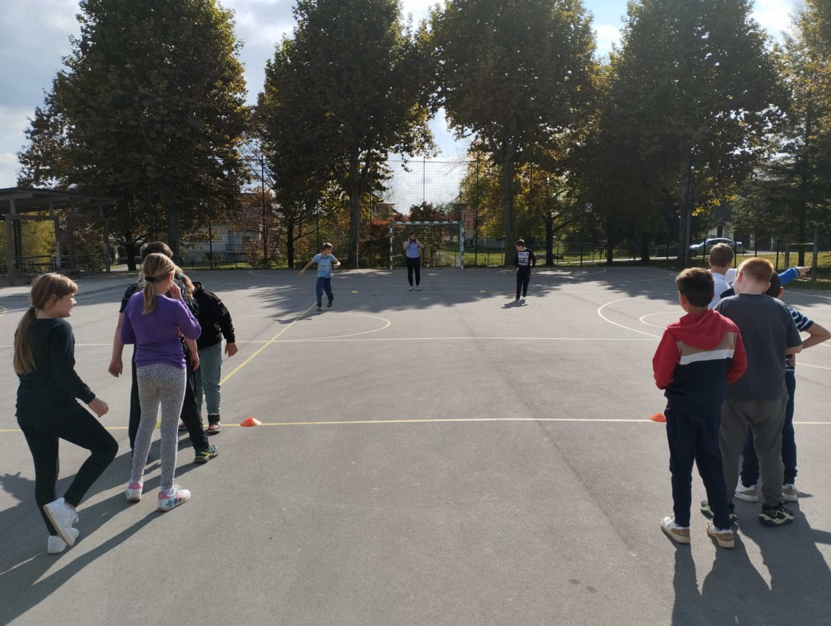 Po predavanju smo šli ven. Najprej smo se ogreli. Nato smo izvajali različne vaje za krepitev mišic z žogo, elastiko in palico. Nato smo imeli štafetno tekmovanje. Ob koncu dneva smo se igrali med dvema ognjema.