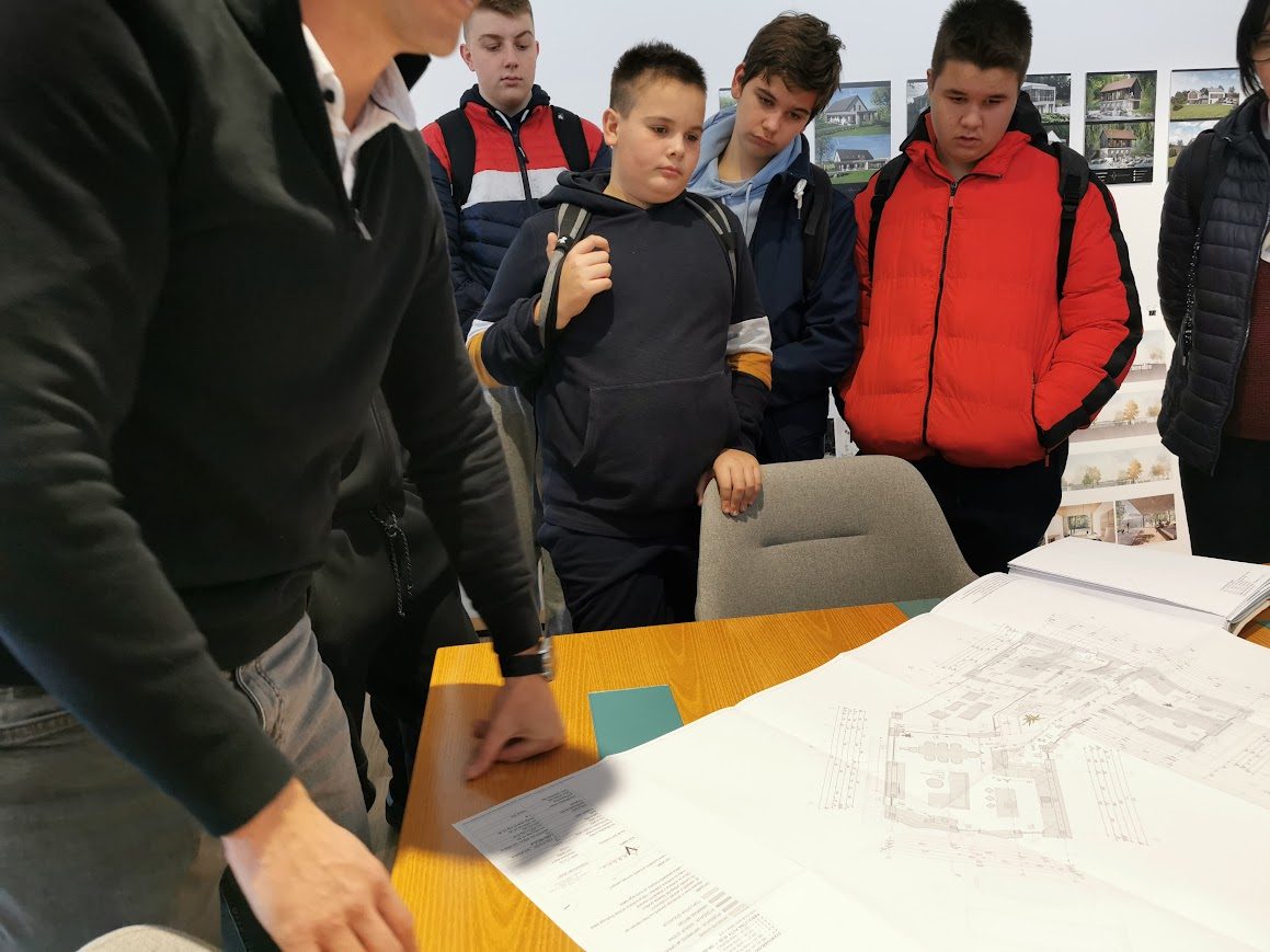 Nato smo se odpravili proti Arhitekturi Vrščaj. Arhitekt nam je predstavil njegovo delo ter projekte na katerih dela, povedal nam je katere vse izobrazbe potrebuješ in kaj vse je treba narediti, da prideš na njegovo pozicijo. V isti stavbi smo si ogledali še kakšno delo imajo električarji pri EMV Vrščaj.