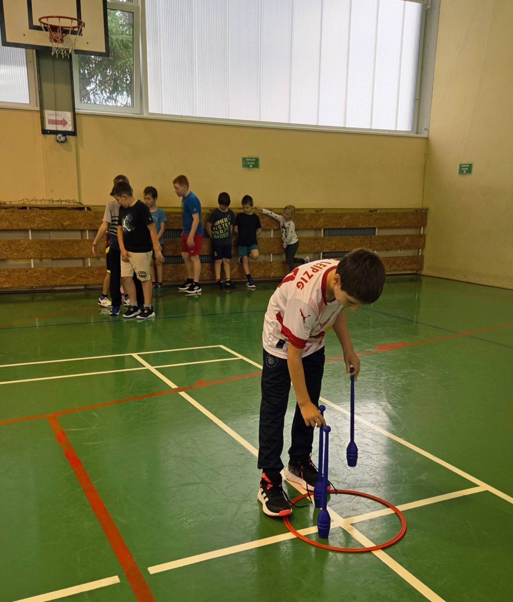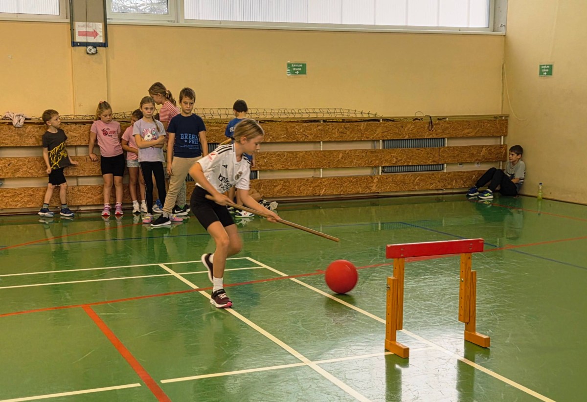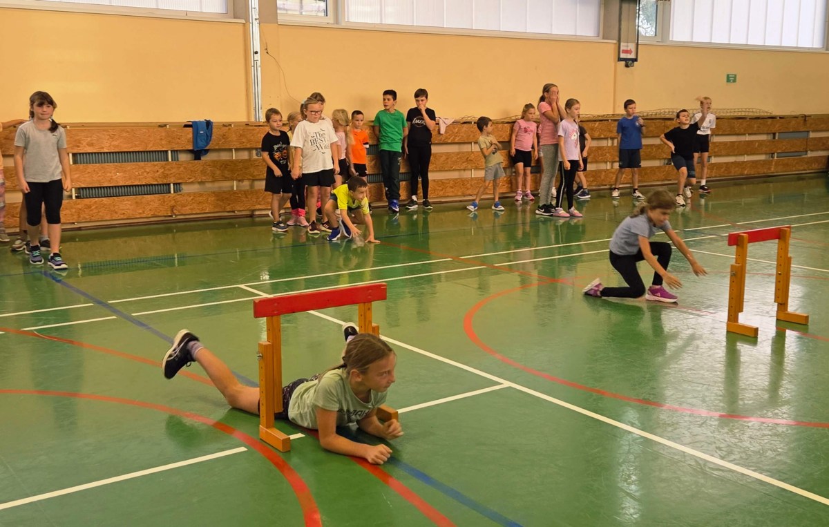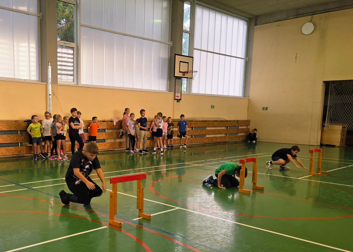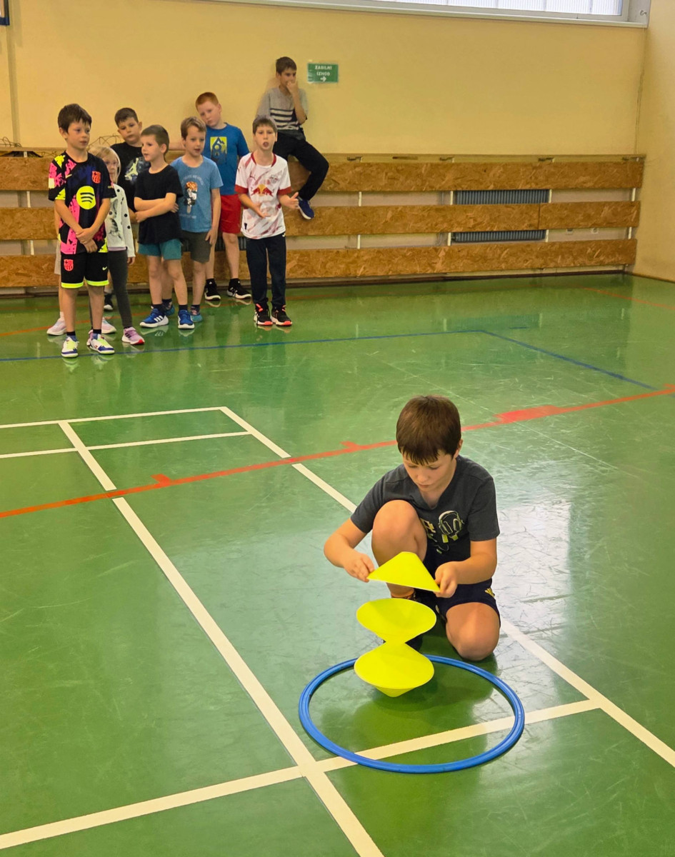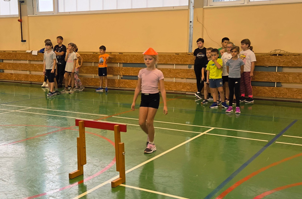 V četrtek, 23. 10. 2025, smo imeli učenci 1., 2., 3., 4. in 5. razreda športni dan. Zjutraj smo se zbrali v telovadnici. Razdelili smo se v 8 skupin. Učiteljica je določila 8 učencev – vodij ekip, ti pa so nato izbrali člane svoje skupine – od petošolcev do prvošolcev. Ko smo bili vsi razporejeni, so 4 ekipe počivale (na blazinah), druge štiri pa tekmovale. Potem pa obratno, saj ni bilo prostora, da bi hkrati tekmovale vse skupine. Preizkusili smo se v teku po štirih, teku ali hoji s stožcem na glavi, plazenju pod oviro, prenašanju treh žog različnih velikosti in teže, prenašanju teniške žogice na badminton loparju, postavljanju stožcev drugega na drugega, postavljanju kijev v obroč sredi poti, teku z oblačenjem in slačenjem brezrokavnika ter ciljanju palice z obročem.