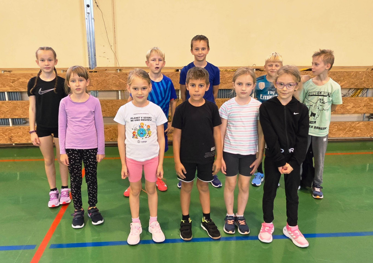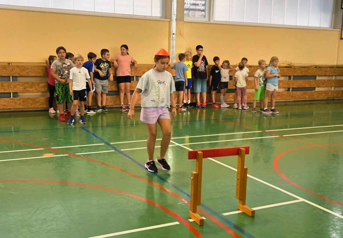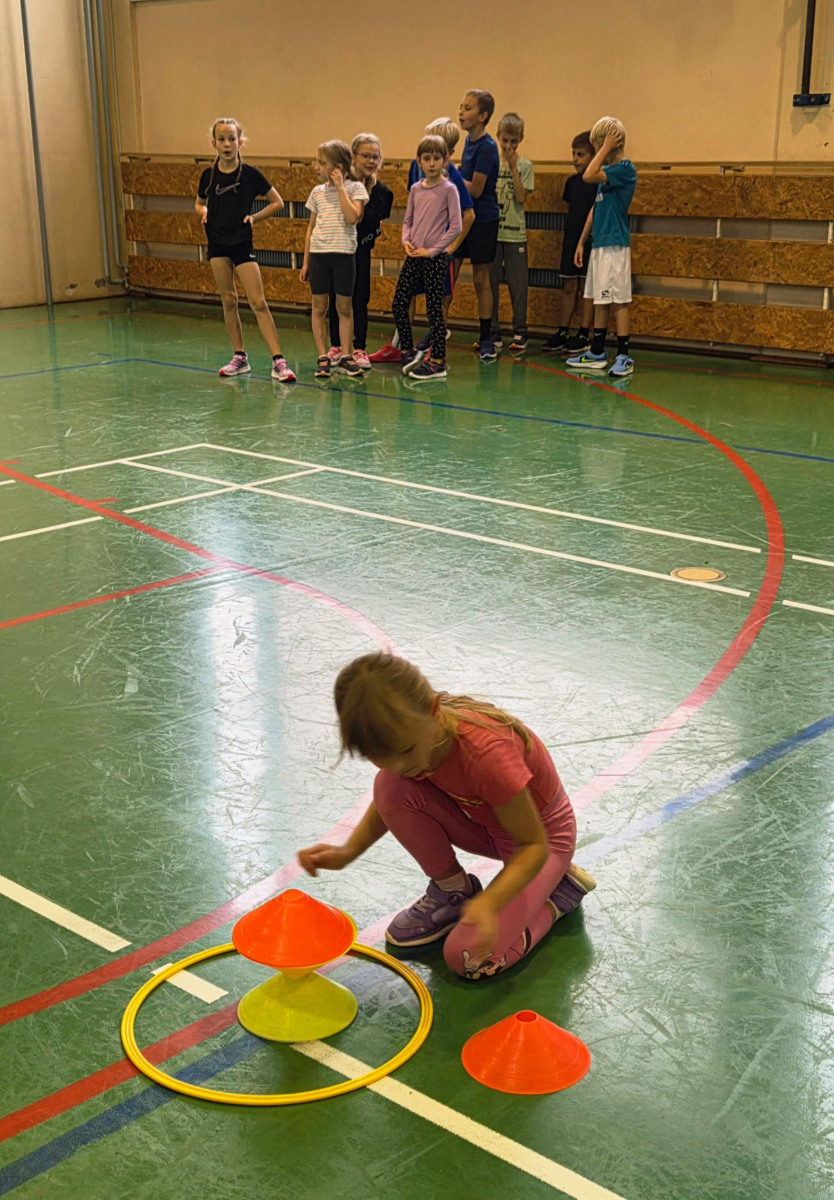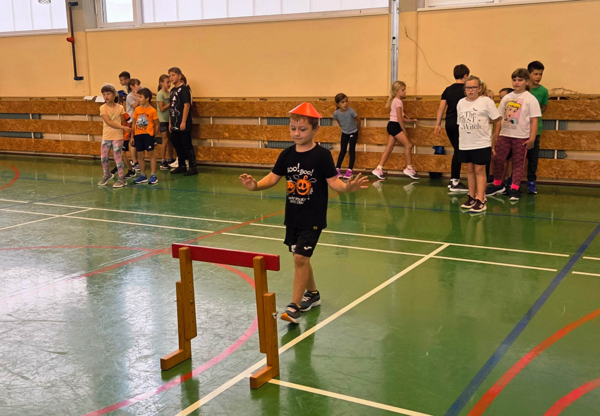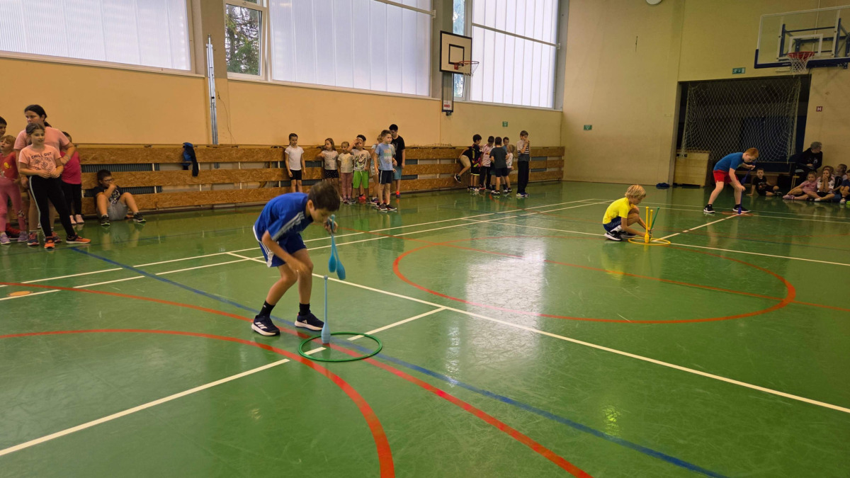 V četrtek, 23. 10. 2025, smo imeli učenci 1., 2., 3., 4. in 5. razreda športni dan. Zjutraj smo se zbrali v telovadnici. Razdelili smo se v 8 skupin. Učiteljica je določila 8 učencev – vodij ekip, ti pa so nato izbrali člane svoje skupine – od petošolcev do prvošolcev. Ko smo bili vsi razporejeni, so 4 ekipe počivale (na blazinah), druge štiri pa tekmovale. Potem pa obratno, saj ni bilo prostora, da bi hkrati tekmovale vse skupine. Preizkusili smo se v teku po štirih, teku ali hoji s stožcem na glavi, plazenju pod oviro, prenašanju treh žog različnih velikosti in teže, prenašanju teniške žogice na badminton loparju, postavljanju stožcev drugega na drugega, postavljanju kijev v obroč sredi poti, teku z oblačenjem in slačenjem brezrokavnika ter ciljanju palice z obročem.