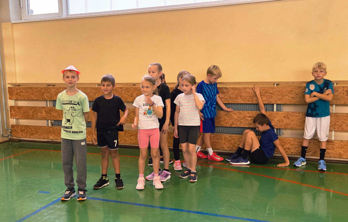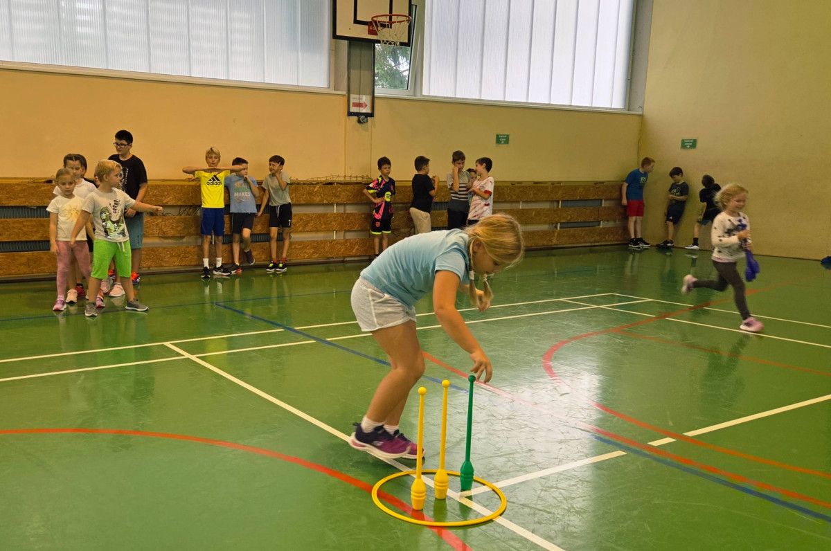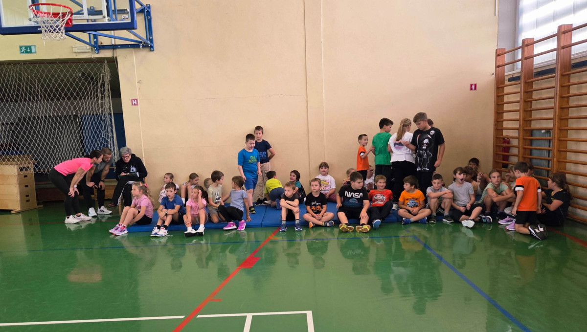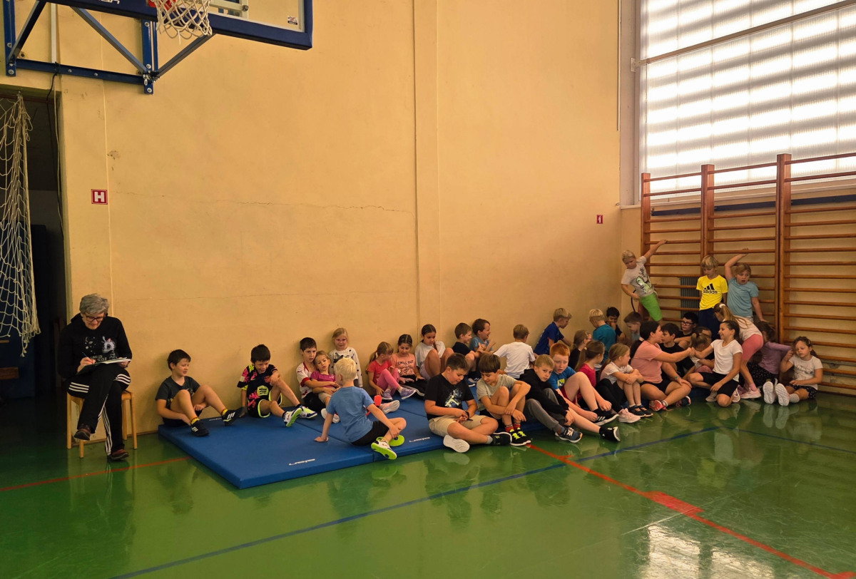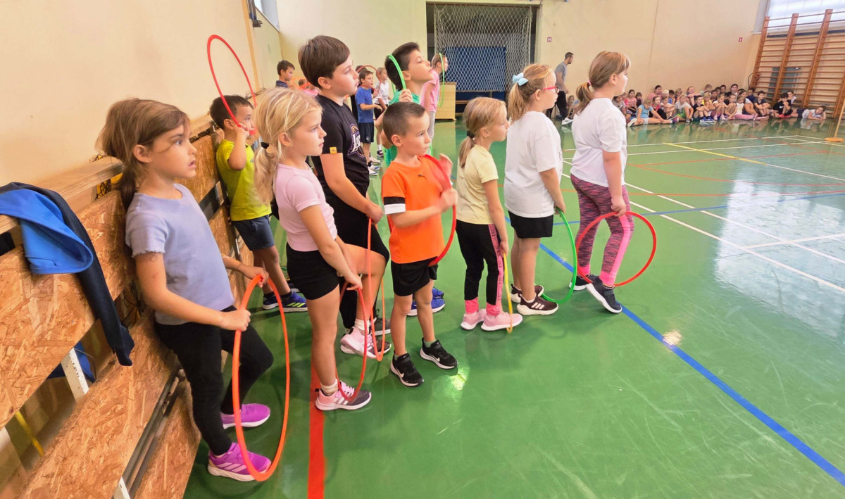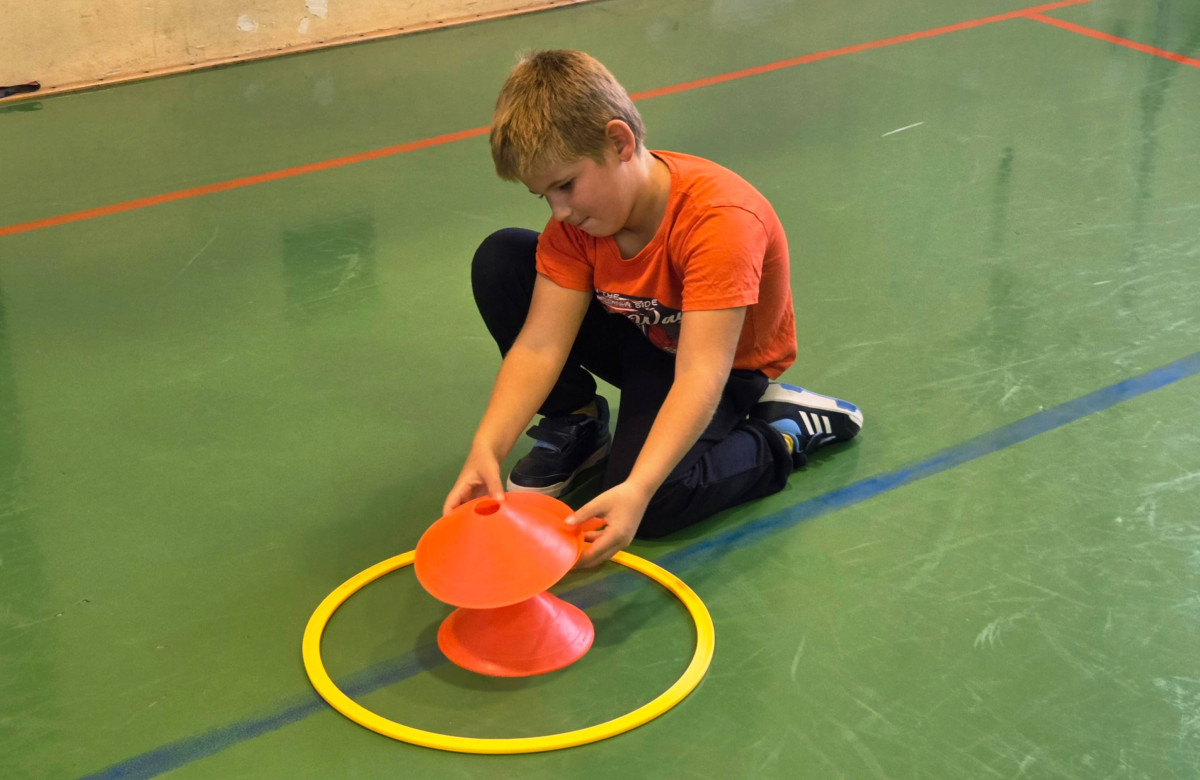 V četrtek, 23. 10. 2025, smo imeli učenci 1., 2., 3., 4. in 5. razreda športni dan. Zjutraj smo se zbrali v telovadnici. Razdelili smo se v 8 skupin. Učiteljica je določila 8 učencev – vodij ekip, ti pa so nato izbrali člane svoje skupine – od petošolcev do prvošolcev. Ko smo bili vsi razporejeni, so 4 ekipe počivale (na blazinah), druge štiri pa tekmovale. Potem pa obratno, saj ni bilo prostora, da bi hkrati tekmovale vse skupine. Preizkusili smo se v teku po štirih, teku ali hoji s stožcem na glavi, plazenju pod oviro, prenašanju treh žog različnih velikosti in teže, prenašanju teniške žogice na badminton loparju, postavljanju stožcev drugega na drugega, postavljanju kijev v obroč sredi poti, teku z oblačenjem in slačenjem brezrokavnika ter ciljanju palice z obročem.