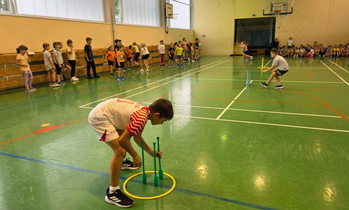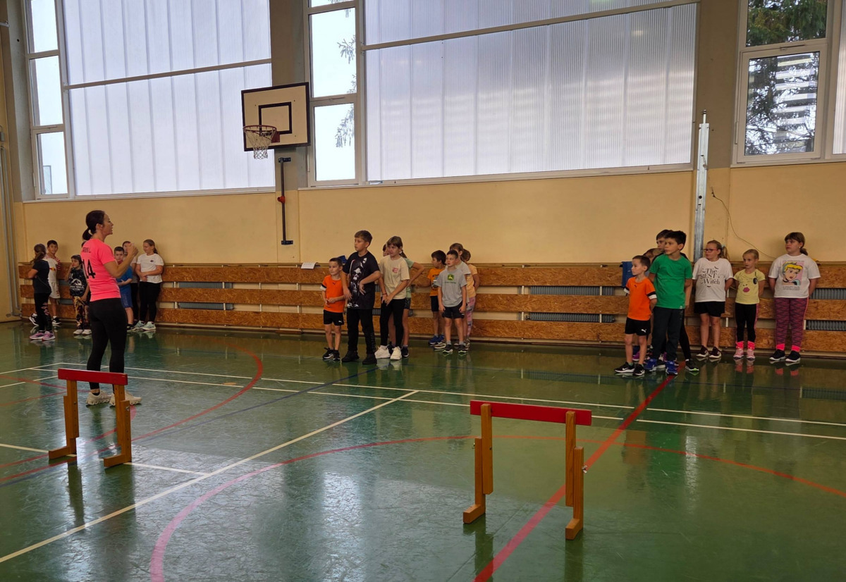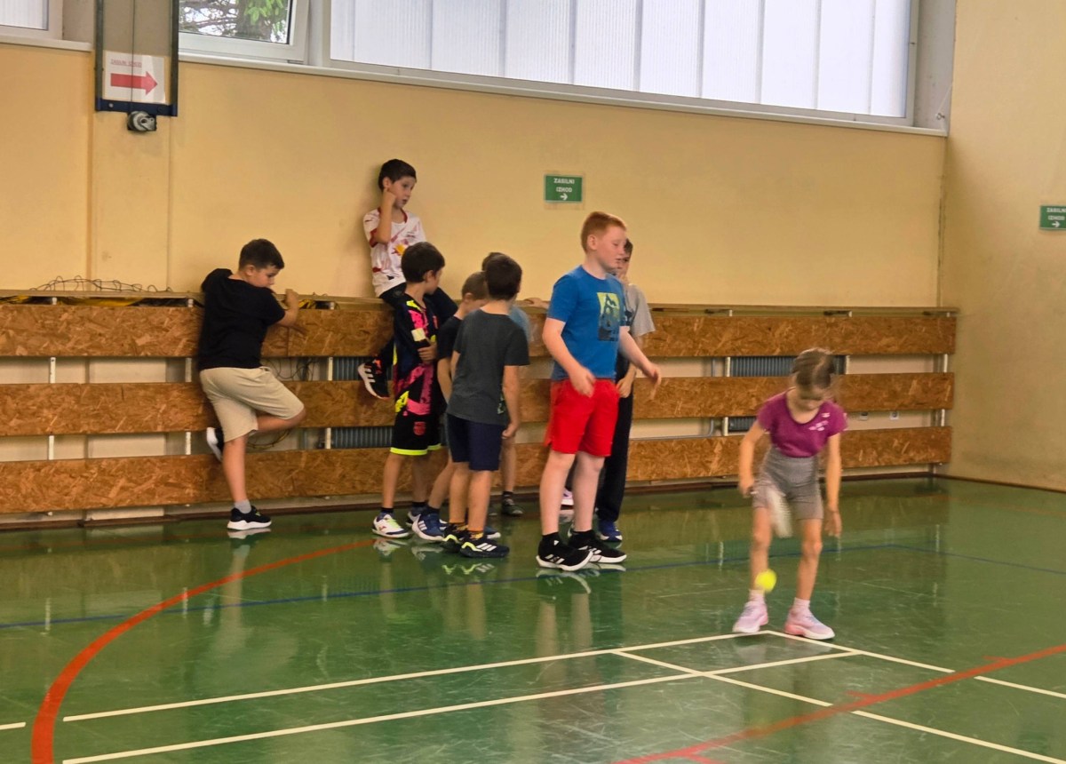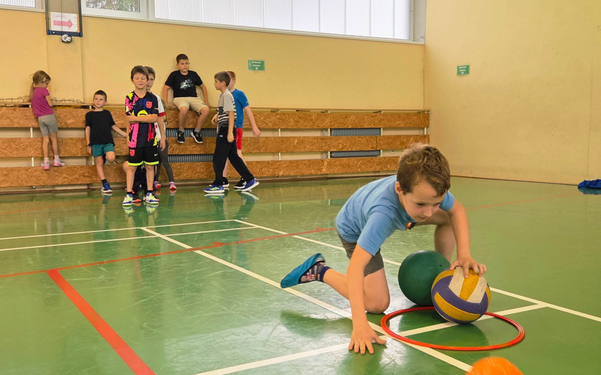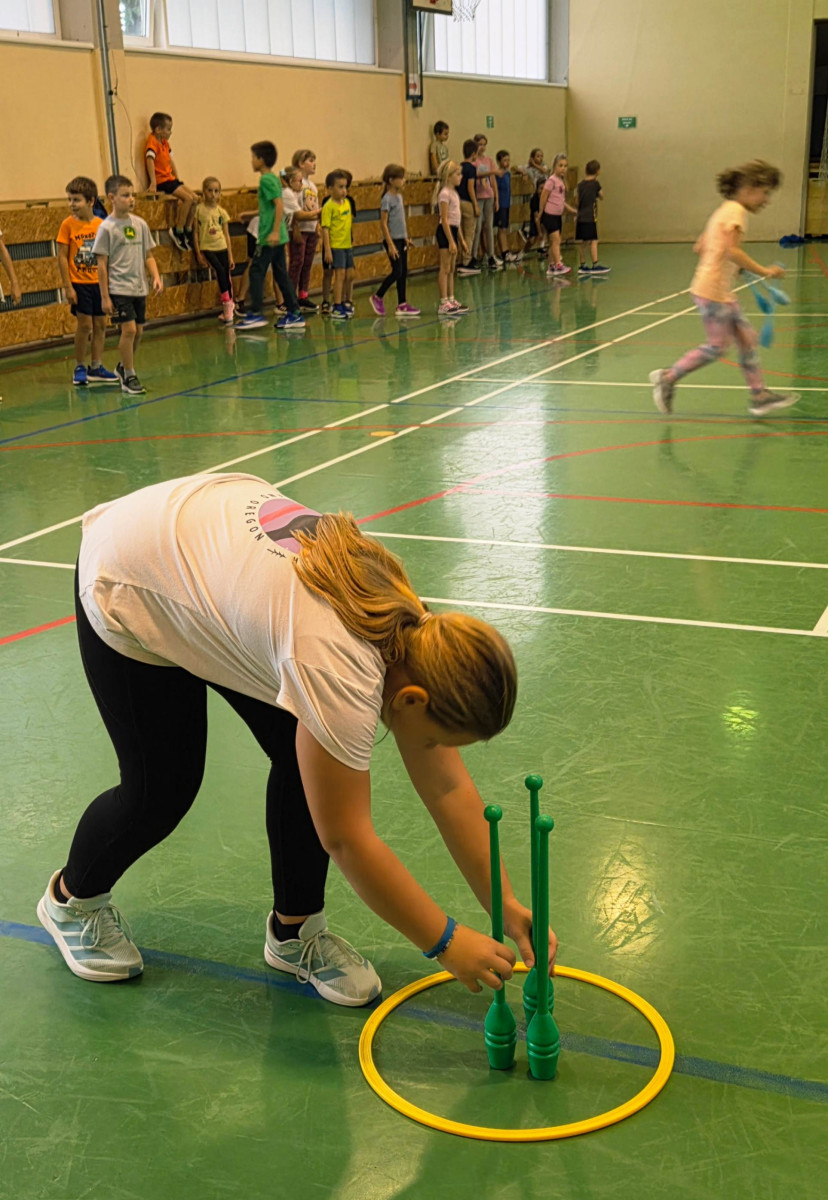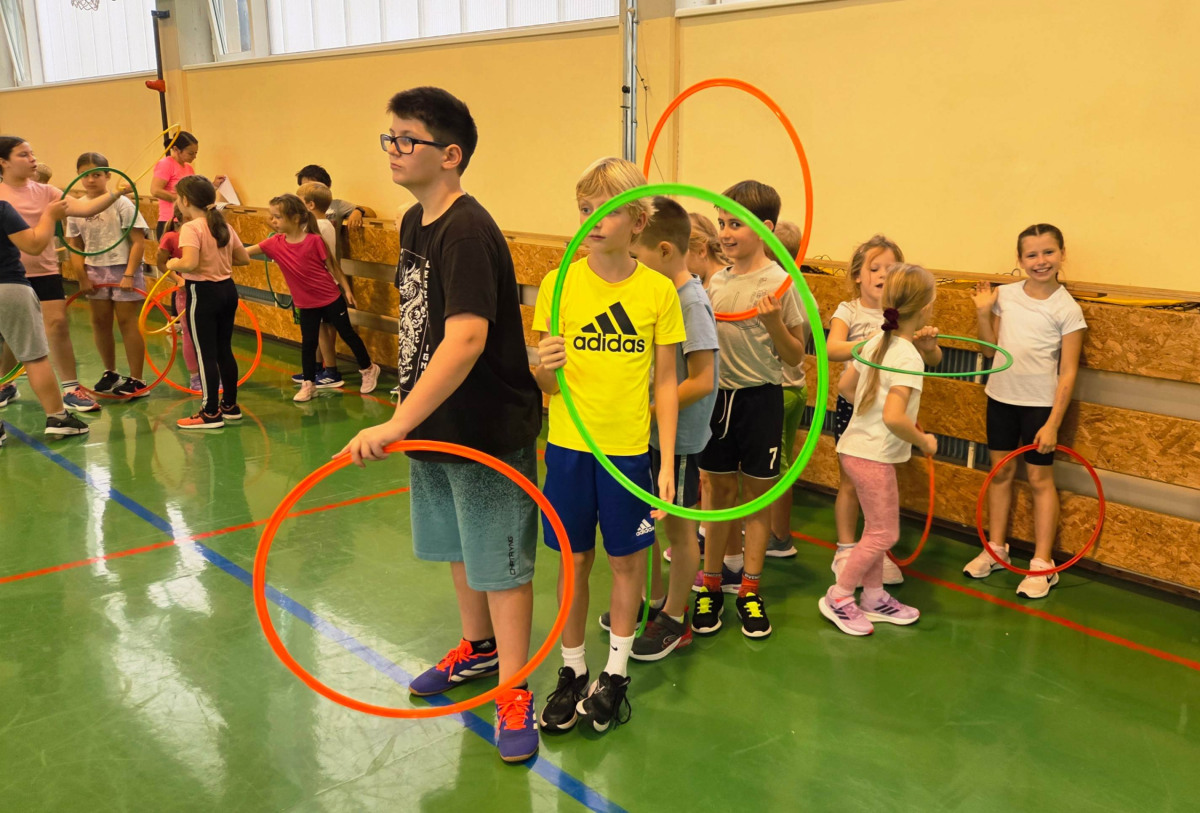 V četrtek, 23. 10. 2025, smo imeli učenci 1., 2., 3., 4. in 5. razreda športni dan. Zjutraj smo se zbrali v telovadnici. Razdelili smo se v 8 skupin. Učiteljica je določila 8 učencev – vodij ekip, ti pa so nato izbrali člane svoje skupine – od petošolcev do prvošolcev. Ko smo bili vsi razporejeni, so 4 ekipe počivale (na blazinah), druge štiri pa tekmovale. Potem pa obratno, saj ni bilo prostora, da bi hkrati tekmovale vse skupine. Preizkusili smo se v teku po štirih, teku ali hoji s stožcem na glavi, plazenju pod oviro, prenašanju treh žog različnih velikosti in teže, prenašanju teniške žogice na badminton loparju, postavljanju stožcev drugega na drugega, postavljanju kijev v obroč sredi poti, teku z oblačenjem in slačenjem brezrokavnika ter ciljanju palice z obročem.