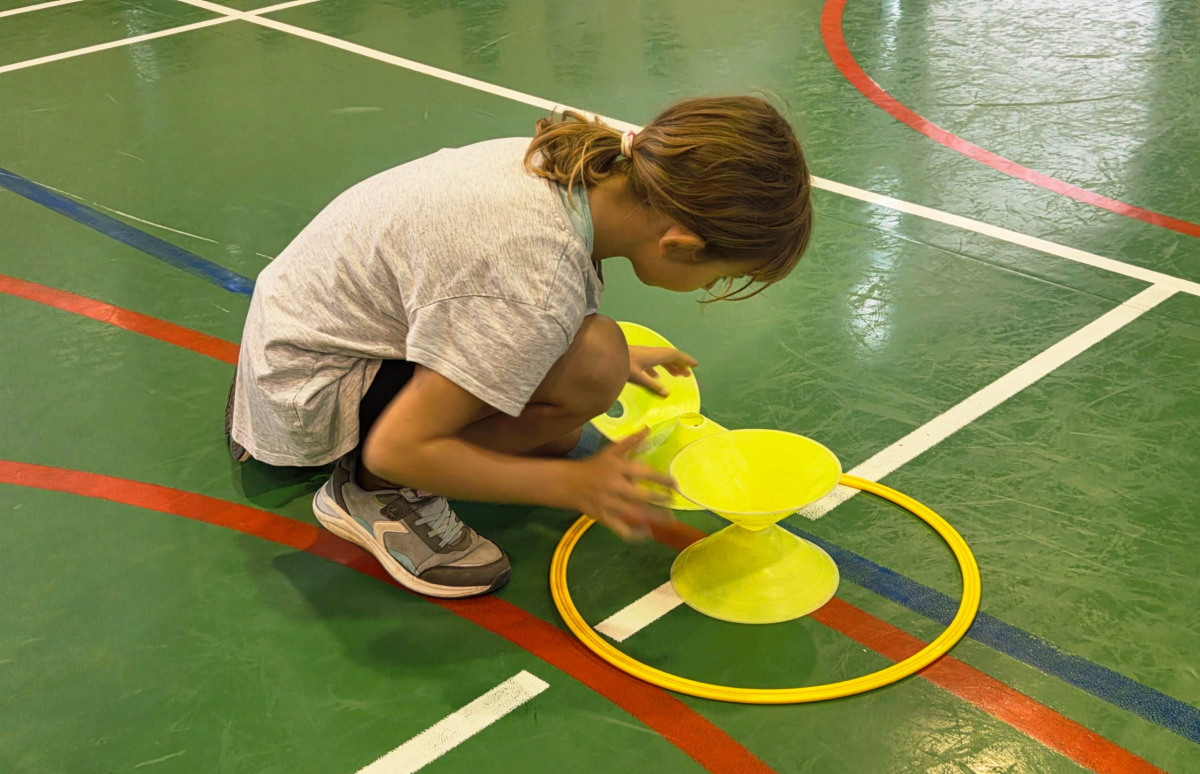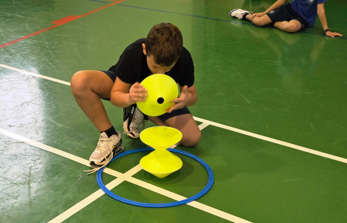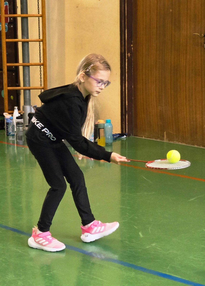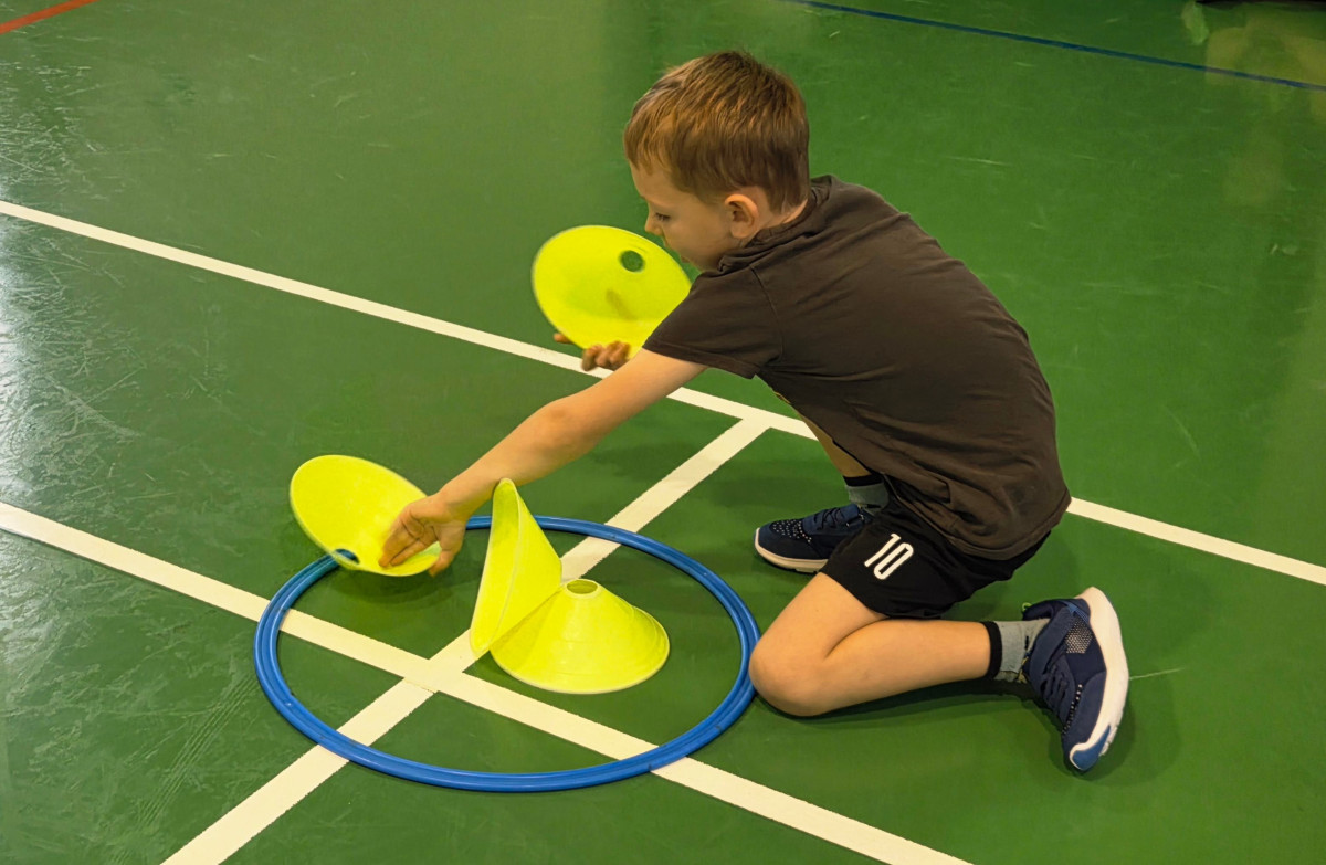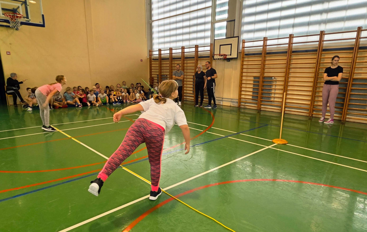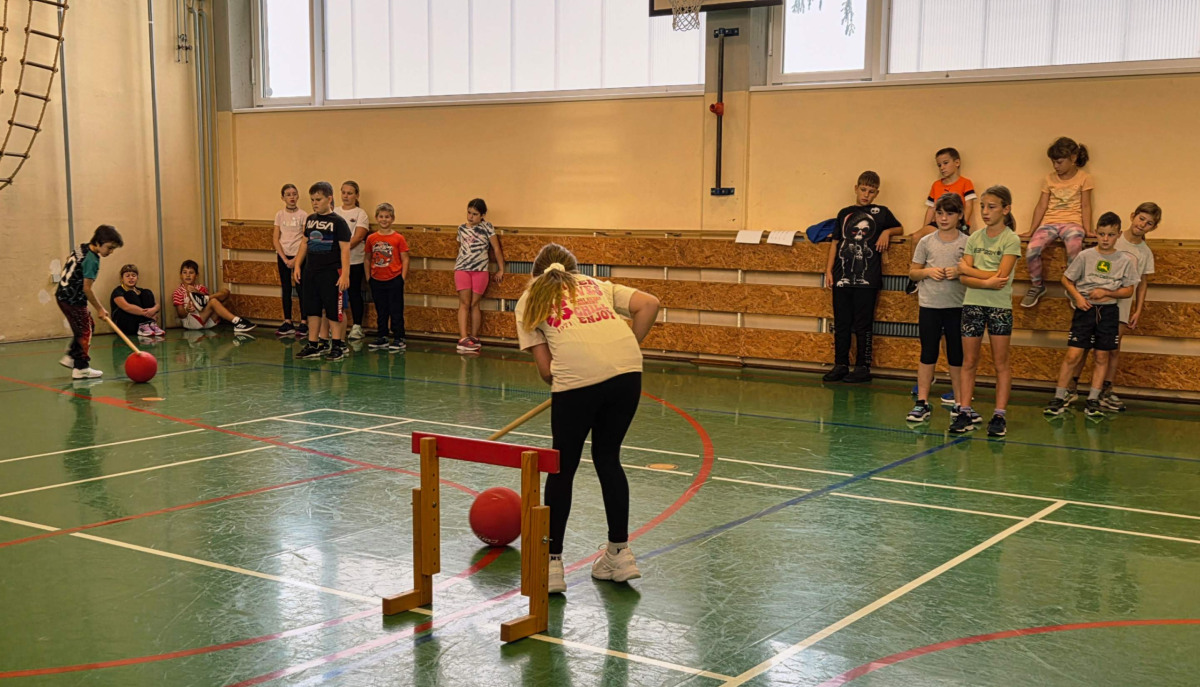 V četrtek, 23. 10. 2025, smo imeli učenci 1., 2., 3., 4. in 5. razreda športni dan. Zjutraj smo se zbrali v telovadnici. Razdelili smo se v 8 skupin. Učiteljica je določila 8 učencev – vodij ekip, ti pa so nato izbrali člane svoje skupine – od petošolcev do prvošolcev. Ko smo bili vsi razporejeni, so 4 ekipe počivale (na blazinah), druge štiri pa tekmovale. Potem pa obratno, saj ni bilo prostora, da bi hkrati tekmovale vse skupine. Preizkusili smo se v teku po štirih, teku ali hoji s stožcem na glavi, plazenju pod oviro, prenašanju treh žog različnih velikosti in teže, prenašanju teniške žogice na badminton loparju, postavljanju stožcev drugega na drugega, postavljanju kijev v obroč sredi poti, teku z oblačenjem in slačenjem brezrokavnika ter ciljanju palice z obročem.