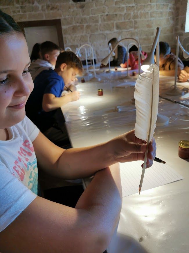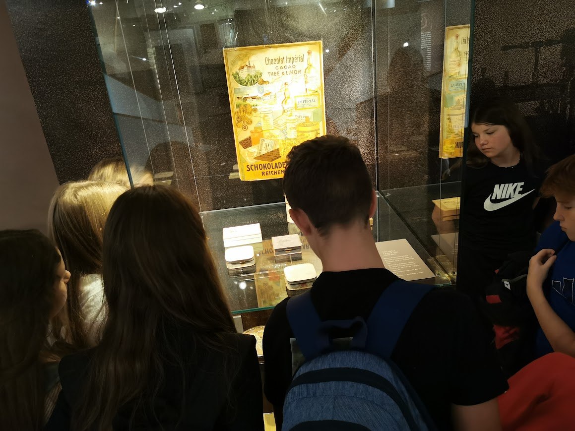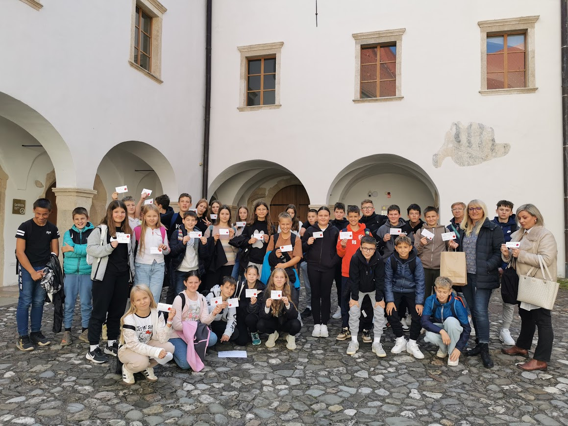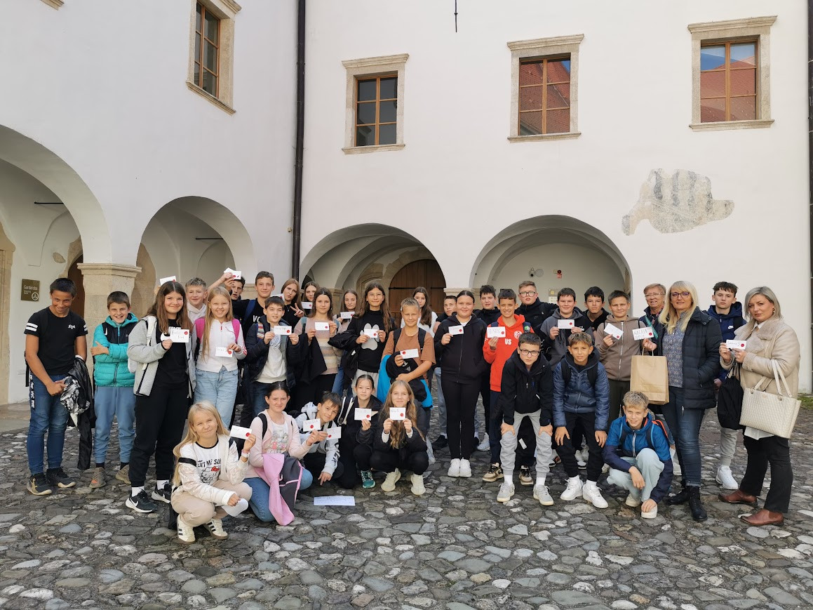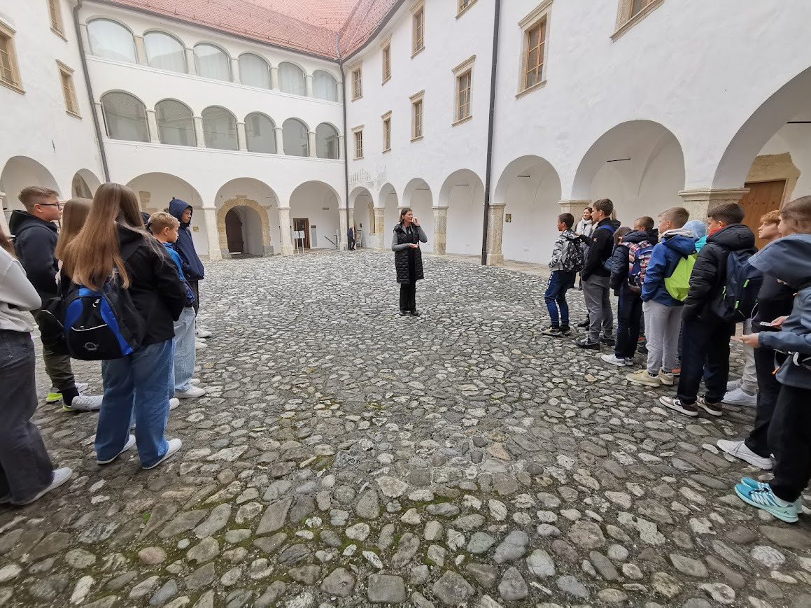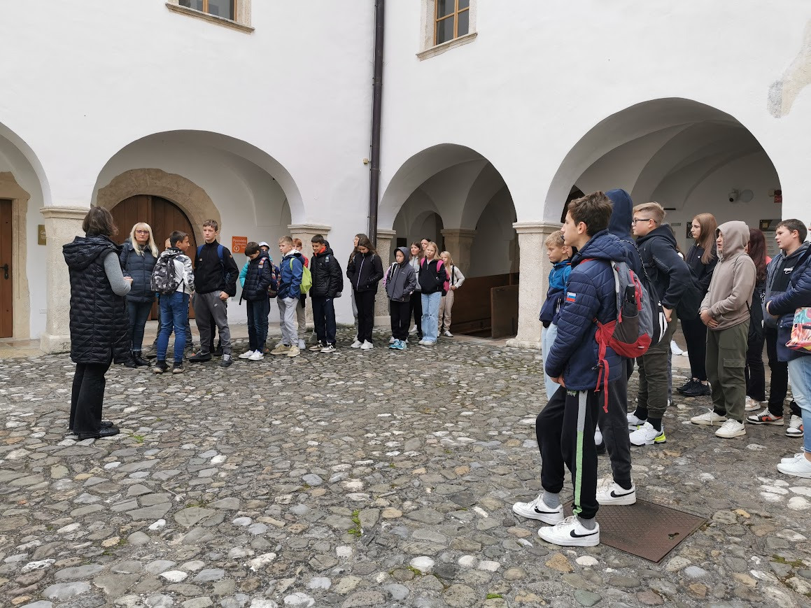 Nato smo se skupini zamenjali, mi smo šli na ogled gradu, 8. razred pa na ogled izdelave čokolade. V gradu je bilo veliko zanimivih slik. Gospa kustosinja nam je povedala o menihih, ki so živeli v zelo majhnih sobicah in cel dan molili. Nato smo imeli delavnico kaligrafije, kjer smo pisali s posebnimi peresi. Naučili smo se napisati svoje ime in priimek s srednjeveško pisavo karolinško minuskulo. Poslovili smo se in se odpeljali na pico in potem odšli na karting stezo.