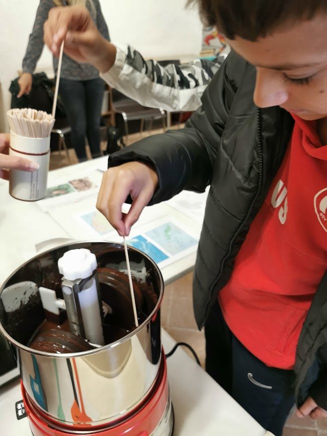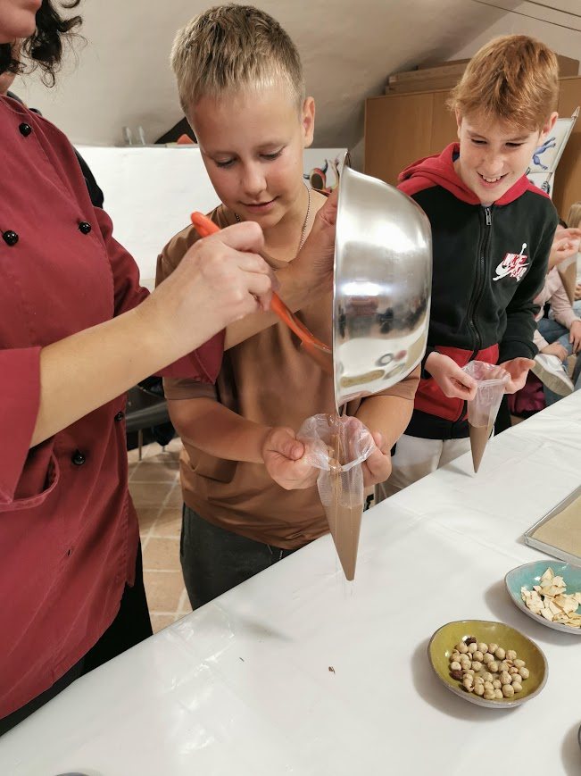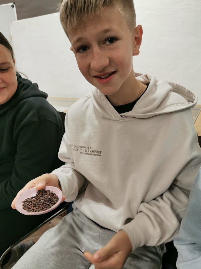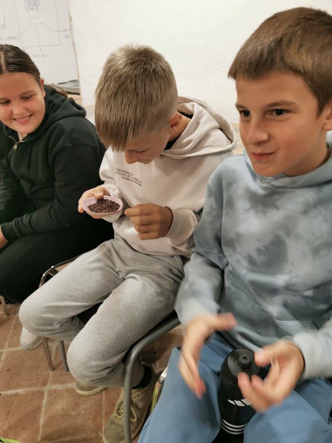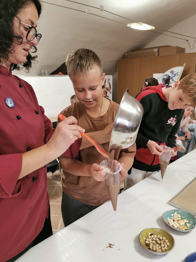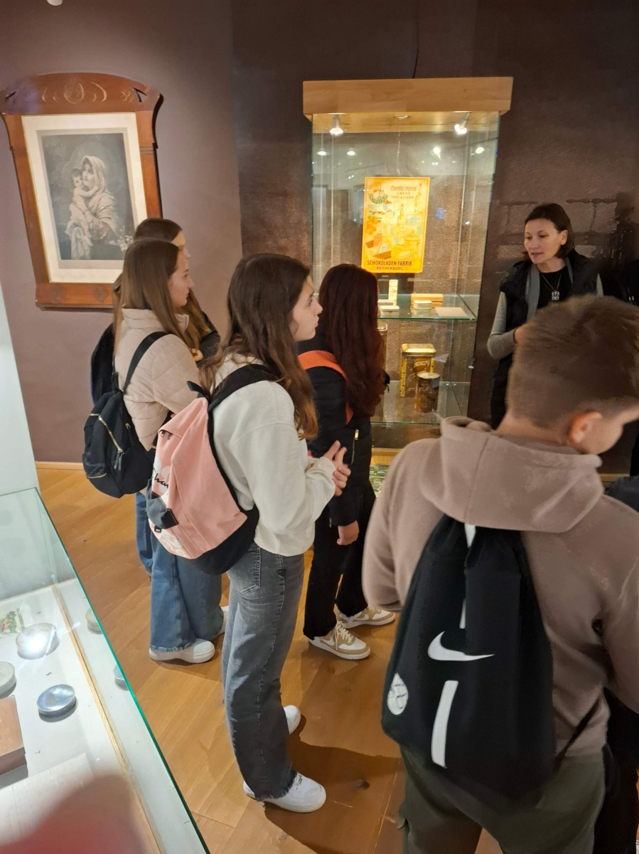 Zjutraj smo se zbrali v šoli in si vzeli malico. Nato smo počakali avtobus in se vkrcali. Pot do Krškega je bila kar dolga, a nam ni bilo dolgčas, ker smo opazovali čudovite pokrajine. Ustavili smo se na prvi postaji, ki je bil grad Rajhenburg v Brestanici pri Krškem. Razdelili smo se v dve skupini. Učenci 6. in 7. razreda smo najprej na delavnici čokolade izvedeli vse o izvoru čokolade, vrstah čokolade, si ogledali kako se čokolada izdela, nato pa smo si naredili svoje čokoladne lizike in si jih poljubno okrasili. Lizike so bile zelo okusne…