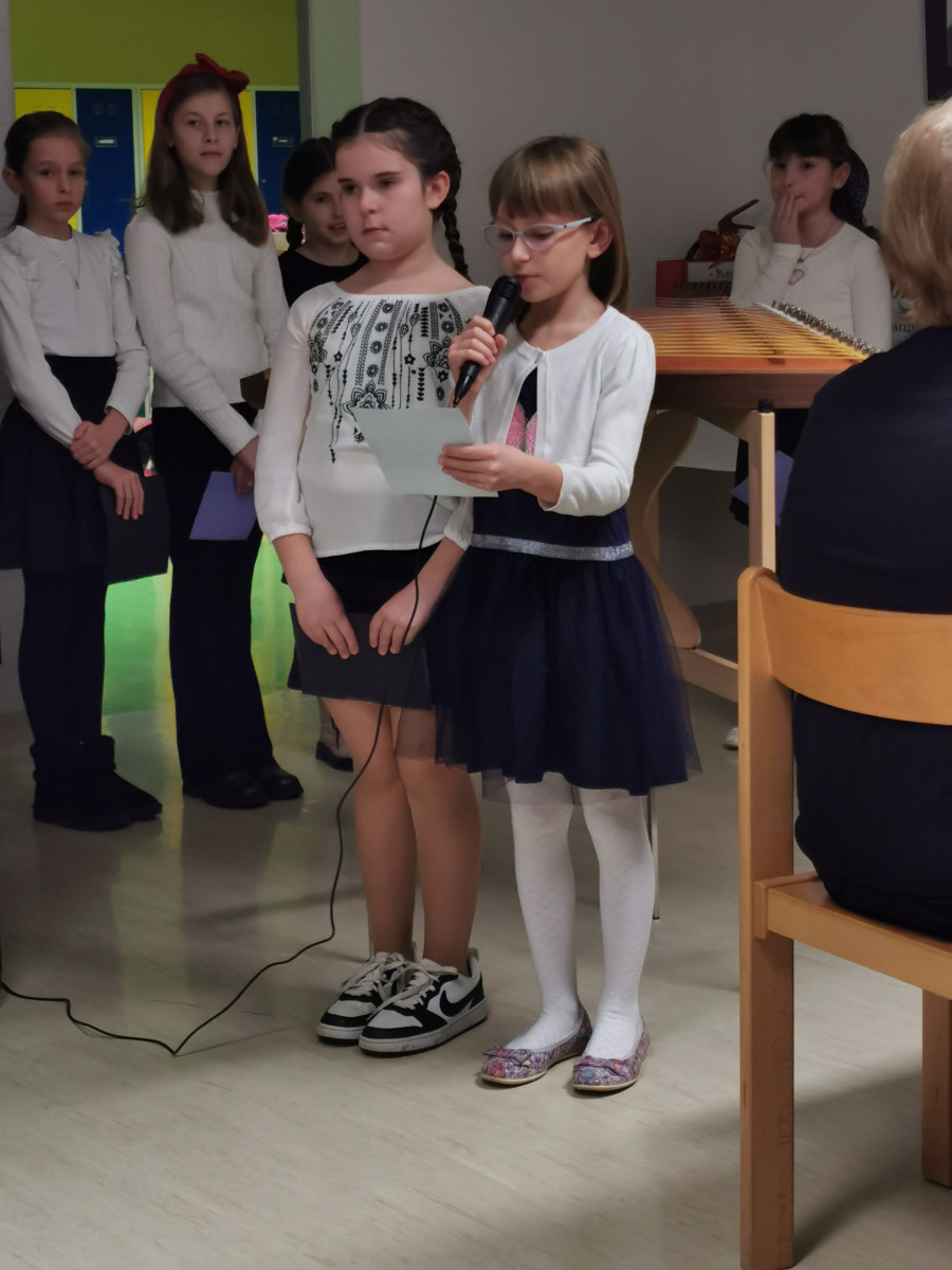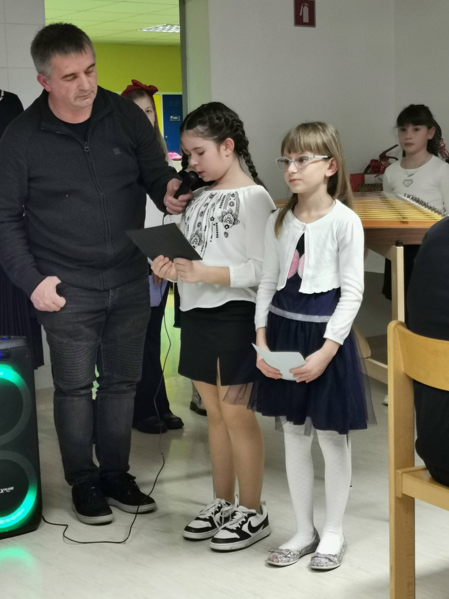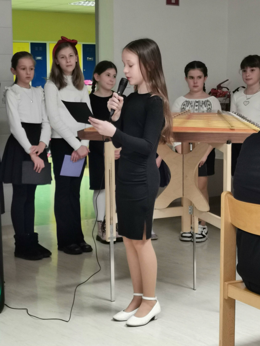 Za vse povabljene smo pripravili kratek kulturni program. Najprej je na oder stopila gospa ravnateljica in pozdravila vse zbrane. Nato pa smo se predstavile učenke Pevske skupine Krnica s pesmijo Trgaj mi rožice. Skupina deluje že pet let in obiskujemo jo dekleta, ki imamo veselje do ljudske glasbe. Po zapeti pesmi je nastopila Nuša Panjan z recitacijo pesmi Zvezdane Majhen Zima snežnogriva.