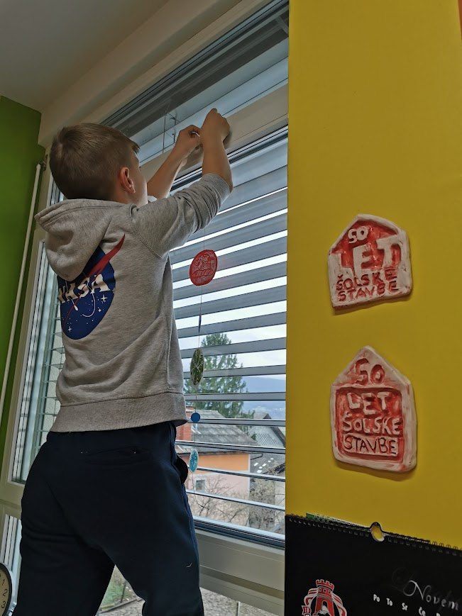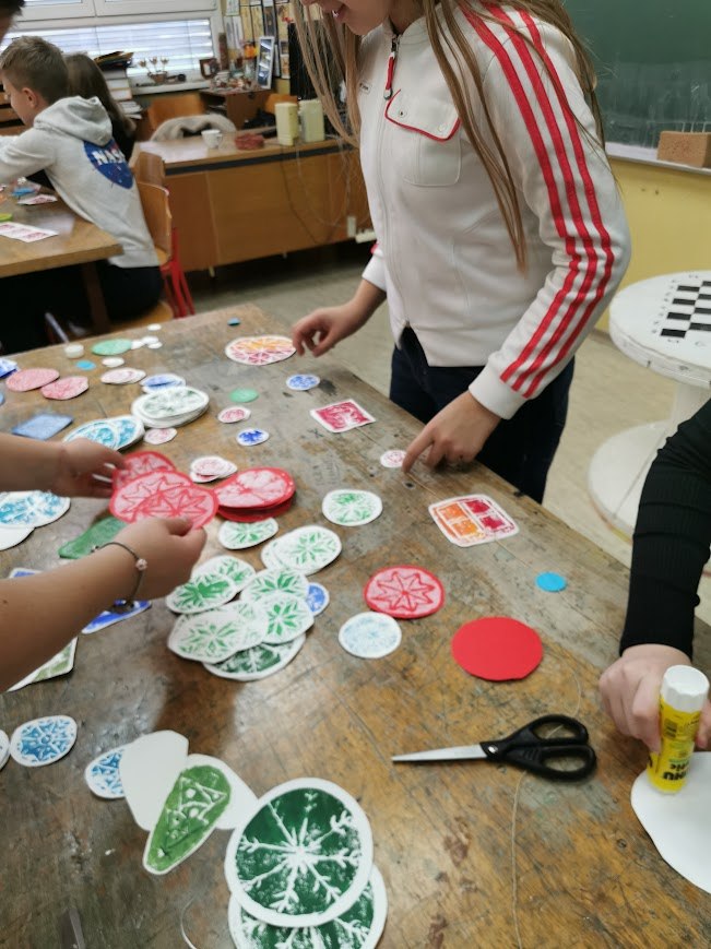 Najprej smo si pripravili grafike z različnimi motivi, kot so npr. smrekica, božični okrasek, zvonček in podobno. To smo naredili tako, da smo v matrico iz stirodurja vrisali motiv, ga premazali z barvo ter odtisnili na papir. Ko so se odtisi posušili, smo motive izrezali in jih nalepili na vrvico iz obeh strani. Tako smo naredili obešanko, ki zdaj krasi naša šolska okna, hodnike in jedilnico.