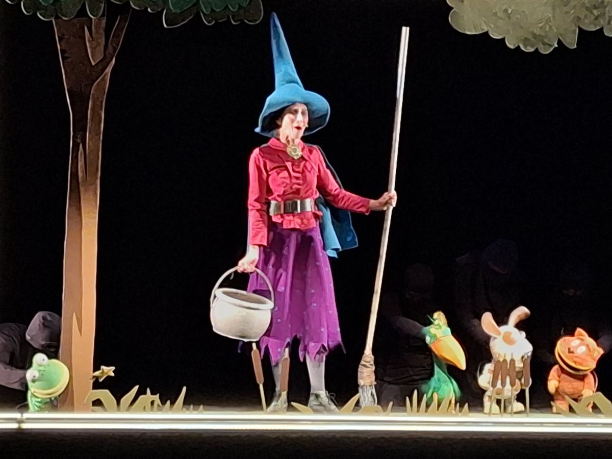 Zgodba govori o prijazni čarovnici in njeni mački, ki letita na metli. Med potjo čarovnica izgublja svoje predmete, a ji pri iskanju pomagajo različne živali, ki se ji nato pridružijo na metli. Ta postane prepolna in se zlomi, čarovnici pa začne groziti zmaj. Živali s sodelovanjem in iznajdljivostjo čarovnico rešijo, na koncu pa vsi skupaj dobijo novo, večjo metlo, na kateri je prostor za vse. Predstava poudarja prijateljstvo, sodelovanje in sprejemanje drugačnosti.