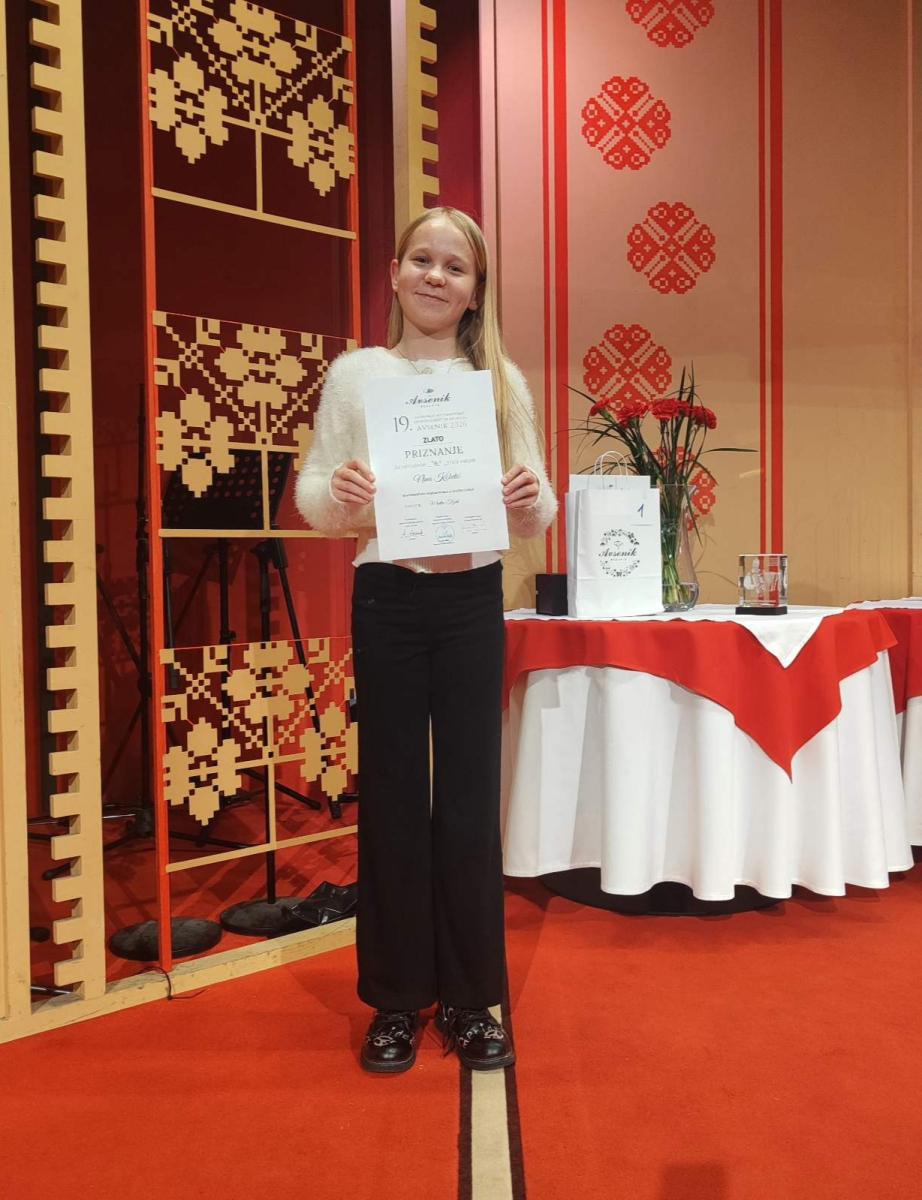 Nina je osvojila ZLATO priznanje in PRVO mesto v starostni kategoriji A ter se z ODLIČNO skupno oceno 98,10 točk uvrstila visoko na lestvici 141 tekmovalcev iz 5 držav.