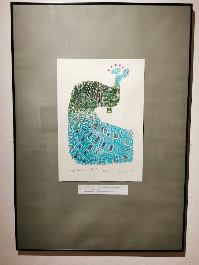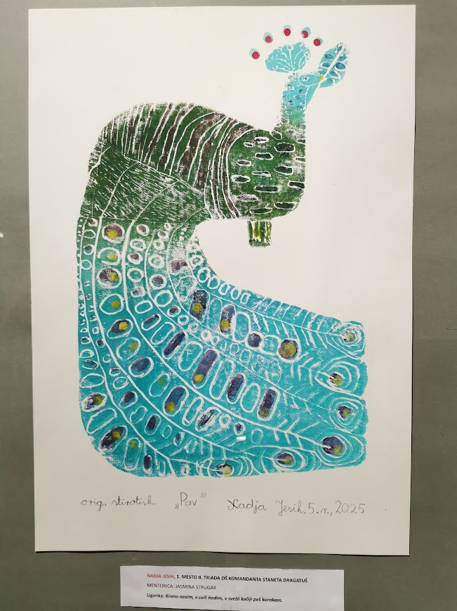Pri likovnem ustvarjanju me je ves čas spodbujala in podpirala učiteljica Jasmina Strugar. Z njenimi nasveti sem ustvarila grafiko z motivom pava.