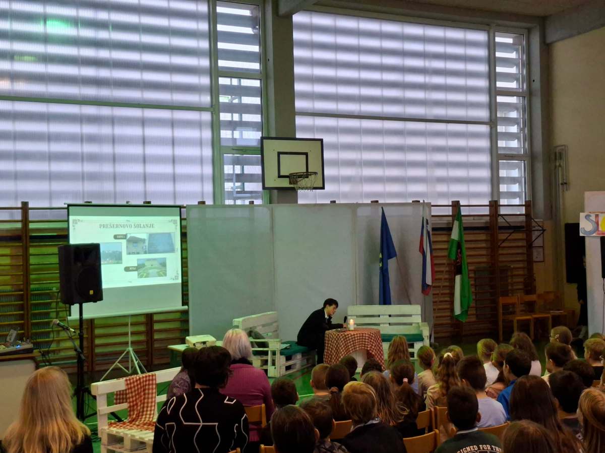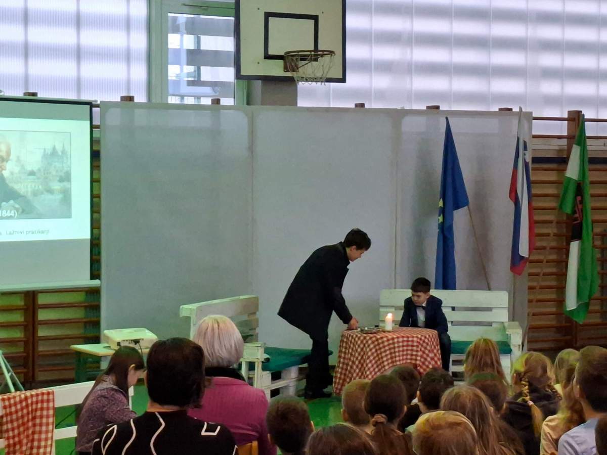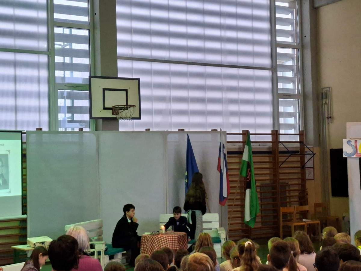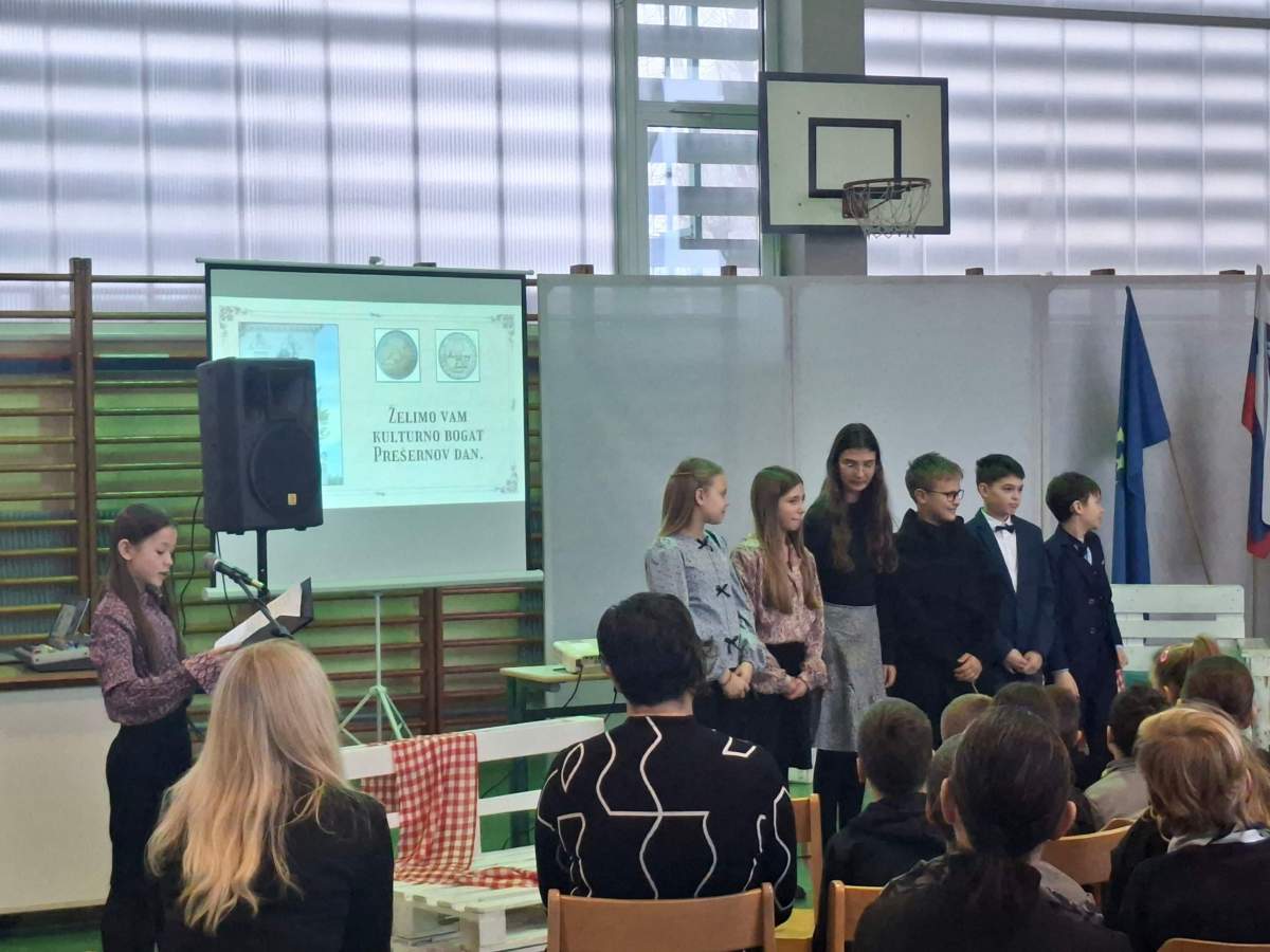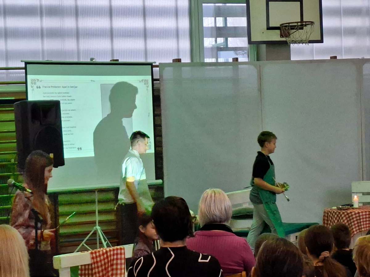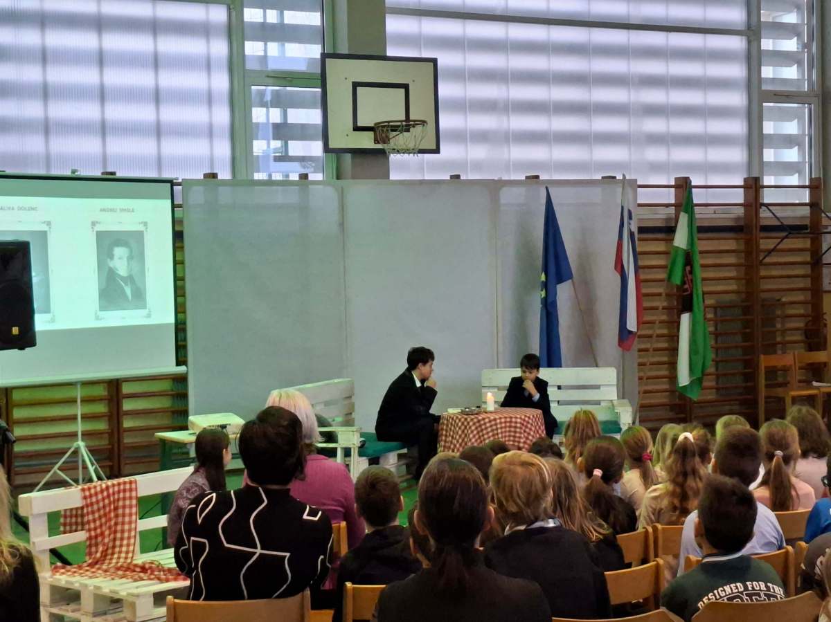 V petek, 6. februarja, je k nam prišel dr. France Prešeren. Za idejno zasnovo in organizacijo prireditve je poskrbela učiteljica Nataša Podhostnik, za sceno in kostume učitelj Žan Brozovič in učenci, za ozvočenje pa računalnikar Rok Mikšič.