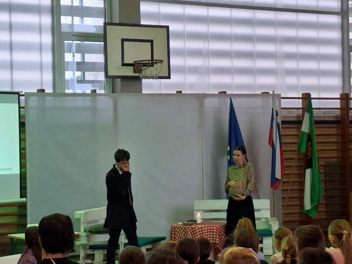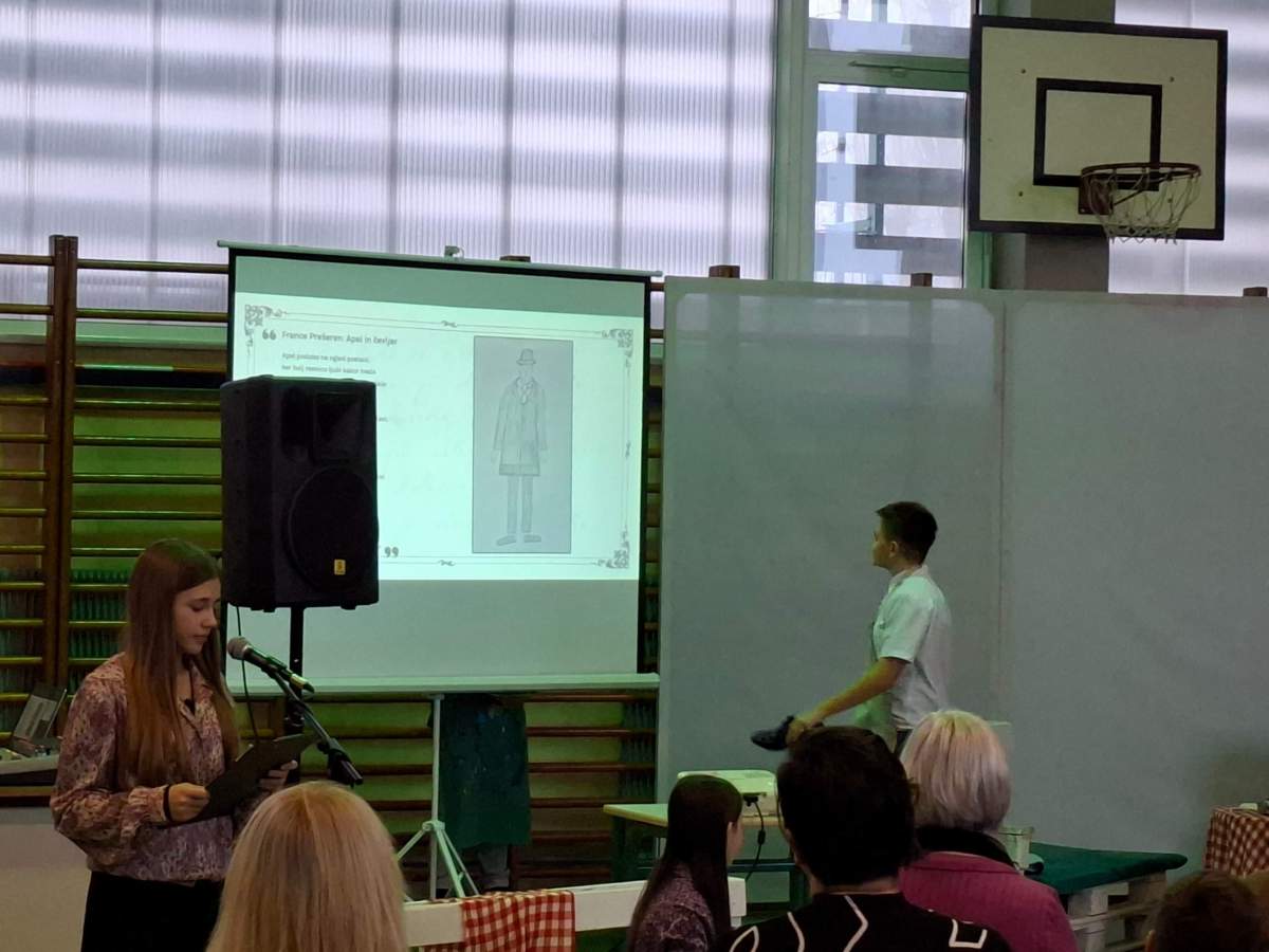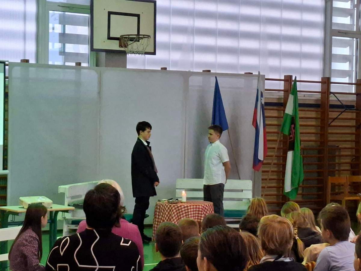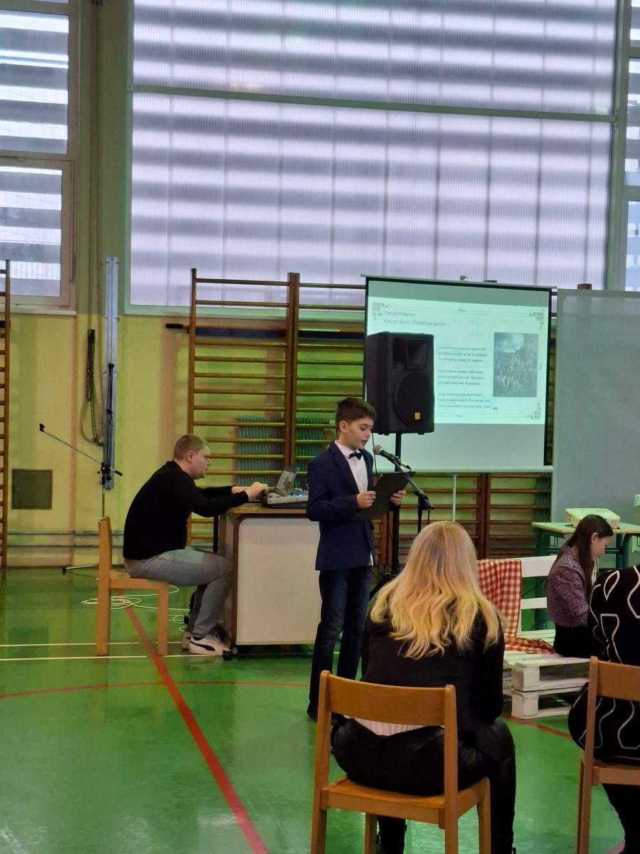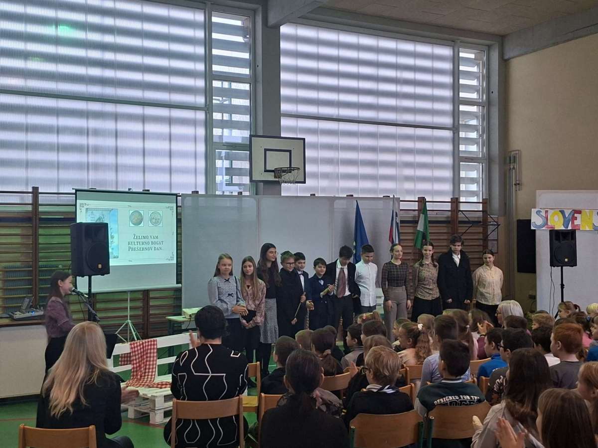 V petek, 6. februarja, je k nam prišel dr. France Prešeren. Za idejno zasnovo in organizacijo prireditve je poskrbela učiteljica Nataša Podhostnik, za sceno in kostume učitelj Žan Brozovič in učenci, za ozvočenje pa računalnikar Rok Mikšič.