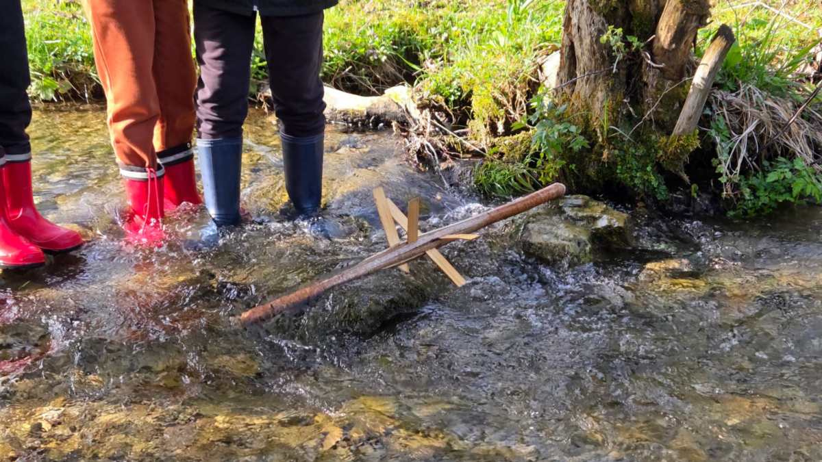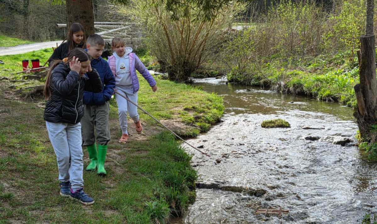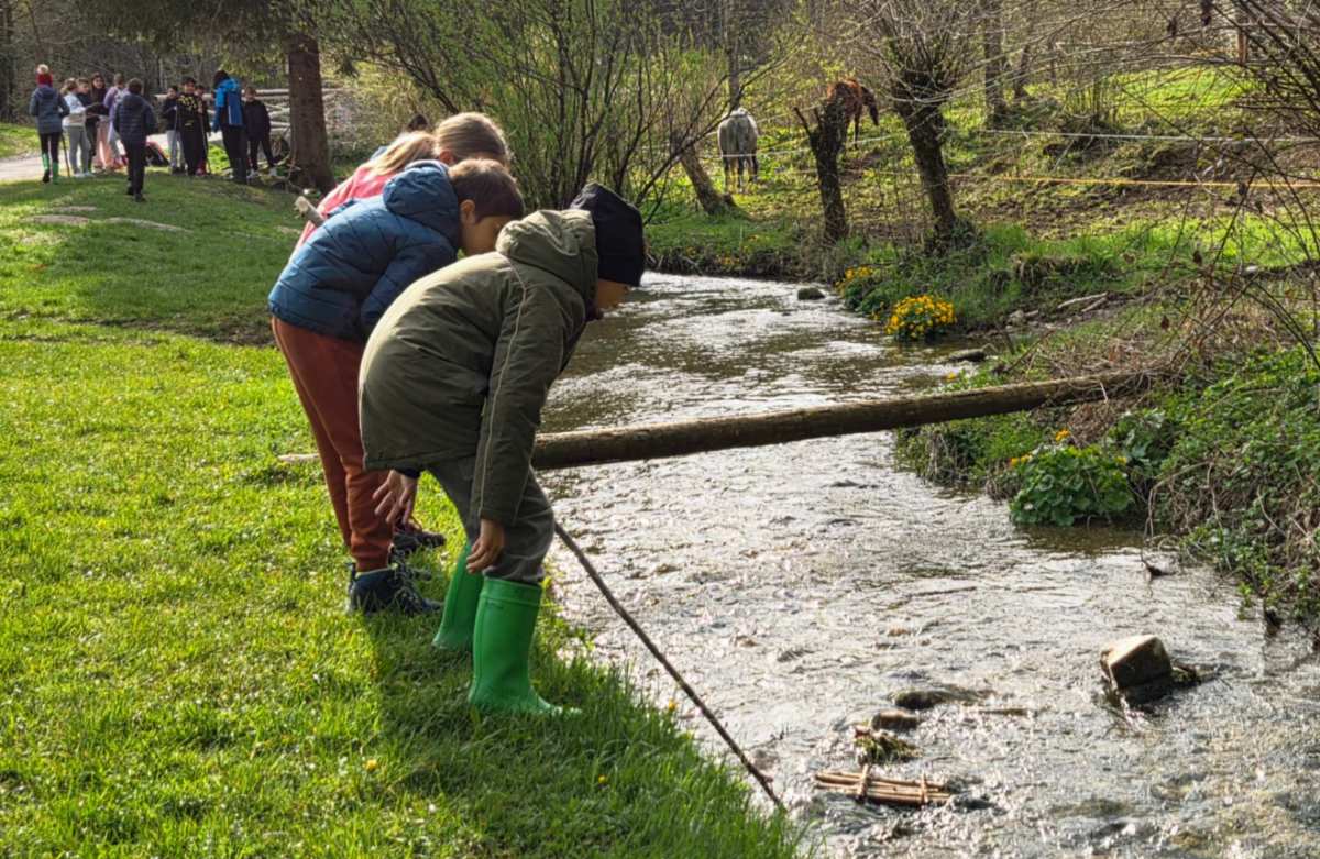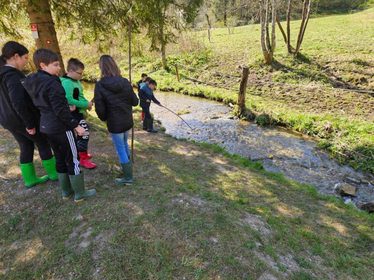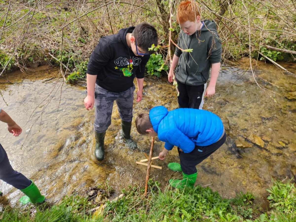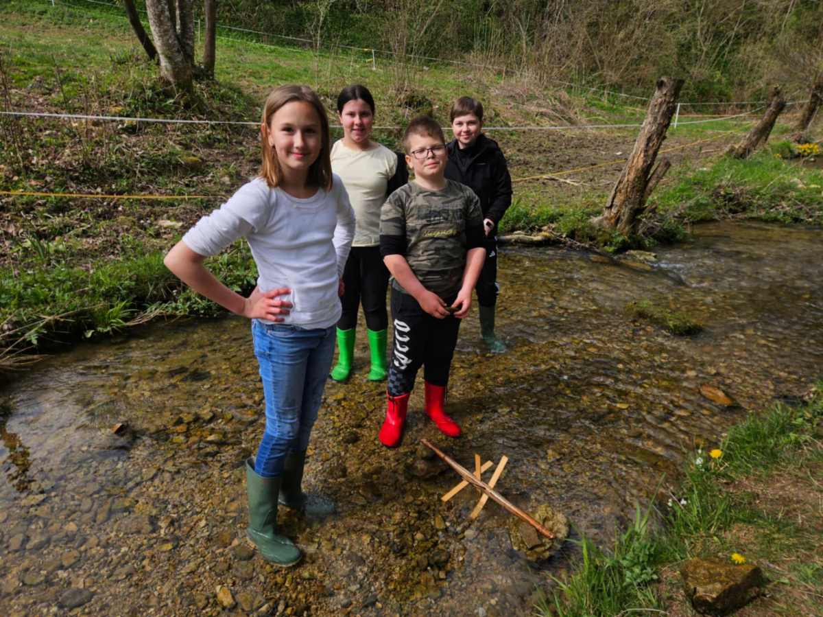Tam nam je učiteljica najprej razložila, kaj bomo delali. Ideja nam je bila takoj všeč. Razdelili smo se v skupine in začeli po potoku spuščati majhne splave. Eden od učencev v naši ekipi je bil zadolžen za postavitev splava v potok in iz njega. Drugi je bil zadolžen za to, če bi splav zataval, ga bi s palico povlekel k sebi.