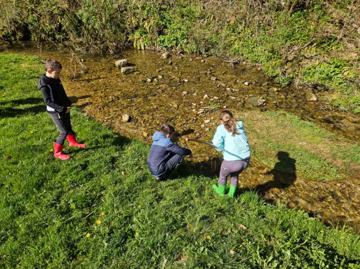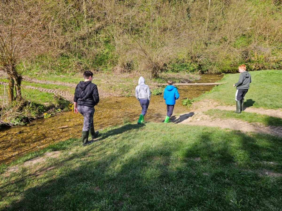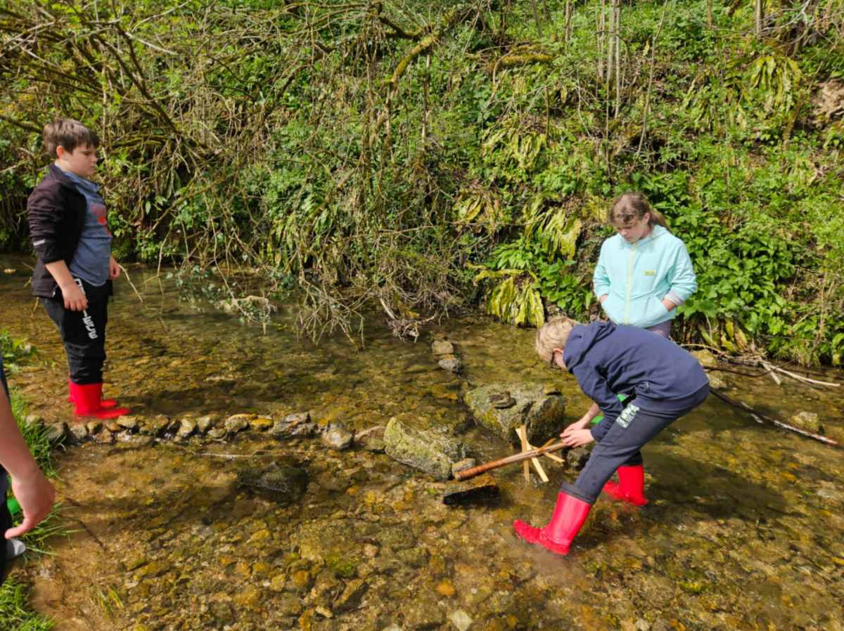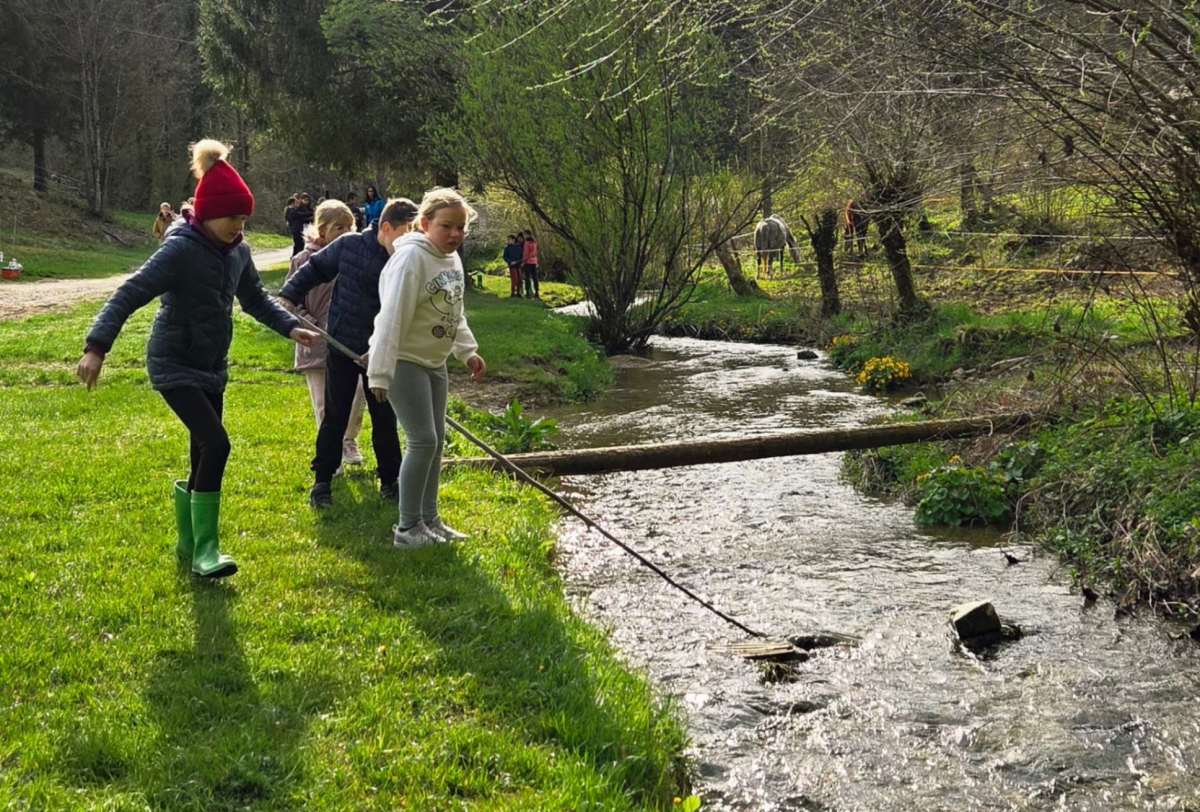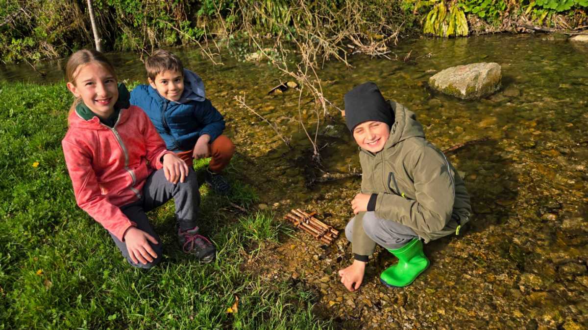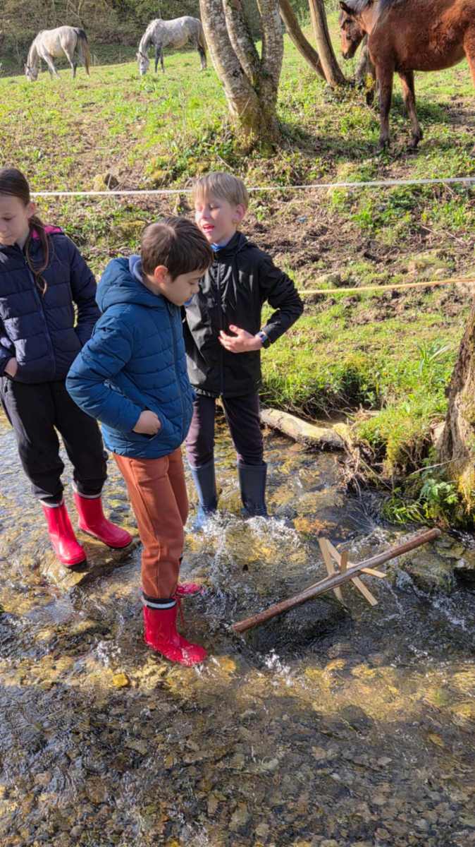 Tam nam je učiteljica najprej razložila, kaj bomo delali. Ideja nam je bila takoj všeč. Razdelili smo se v skupine in začeli po potoku spuščati majhne splave. Eden od učencev v naši ekipi je bil zadolžen za postavitev splava v potok in iz njega. Drugi je bil zadolžen za to, če bi splav zataval, ga bi s palico povlekel k sebi.